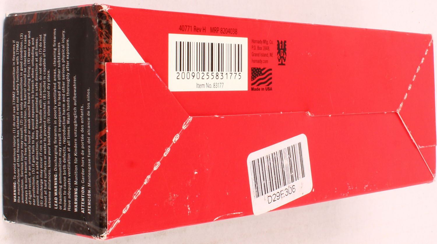 Hornady, Varmint Express, 17 Mach 2, 17 Grain V-Max, Full brick of 10 boxes, 1pc. multi-colored box, box is solid with excellent color, Ammo is excellent. Grade: Excellent ++ - Value: 40 to 120