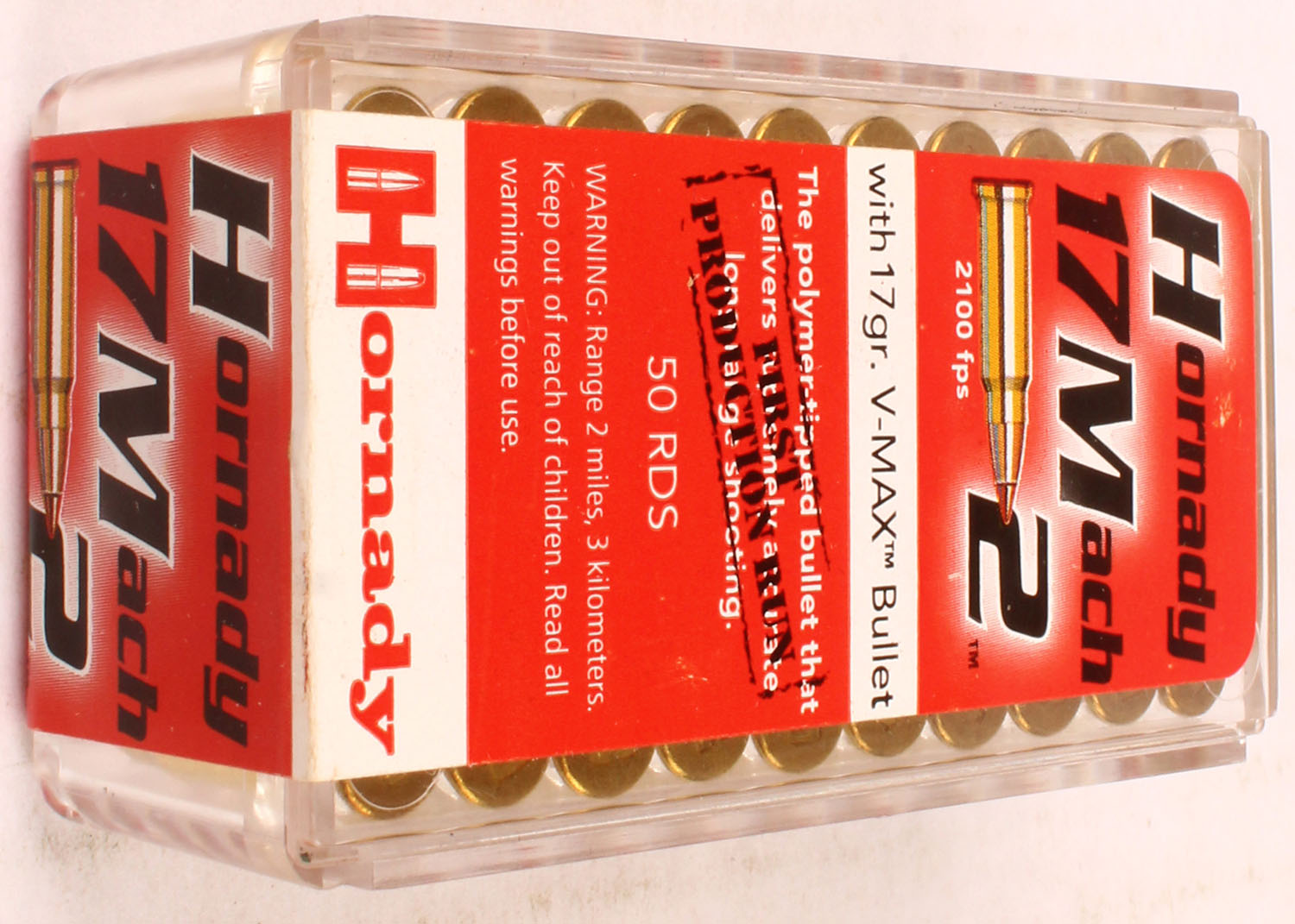 Hornady, 17 Mach 2 with over stamp stating ''First Production Run'', 17 Grain V-Max, FULL & SEALED, 1pc. multi-colored box, box is solid with excellent color, Ammo is excellent. Grade: Excellent ++ - Value: 10 to 60