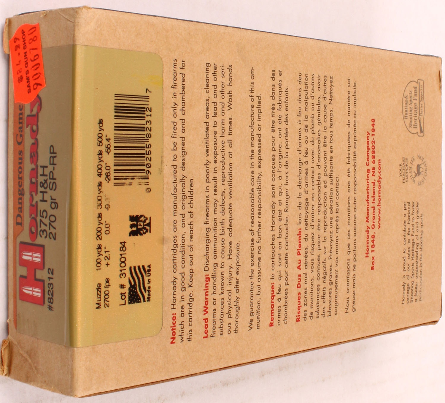 Hornady, Dangerous Game Series, 375 H&H, 270 Grain SP-RP, Full, 1pc. multi-colored box, box is solid with excellent color, Ammo is excellent. Grade: Excellent ++ - Value: 20 to 60