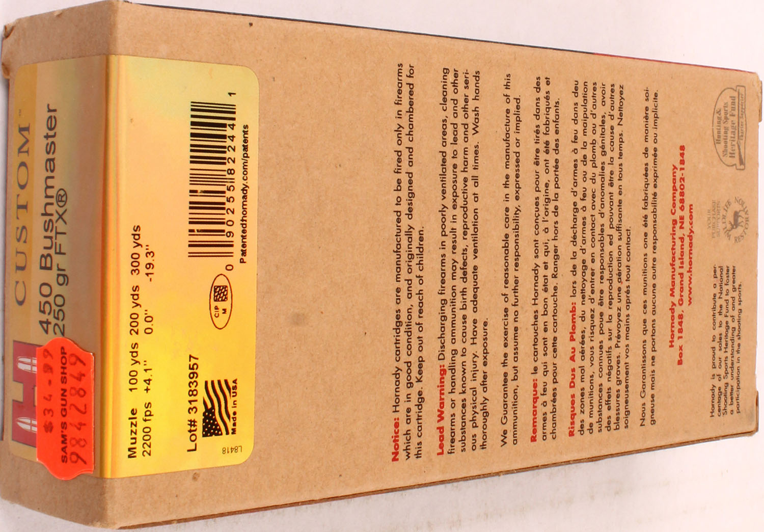 Hornady, Custom, 450 Bushmaster, 250 Grain FTX, Full, 1pc. multi-colored box, box is solid with excellent color, Ammo is excellent. Grade: Excellent ++ - Value: 20 to 60