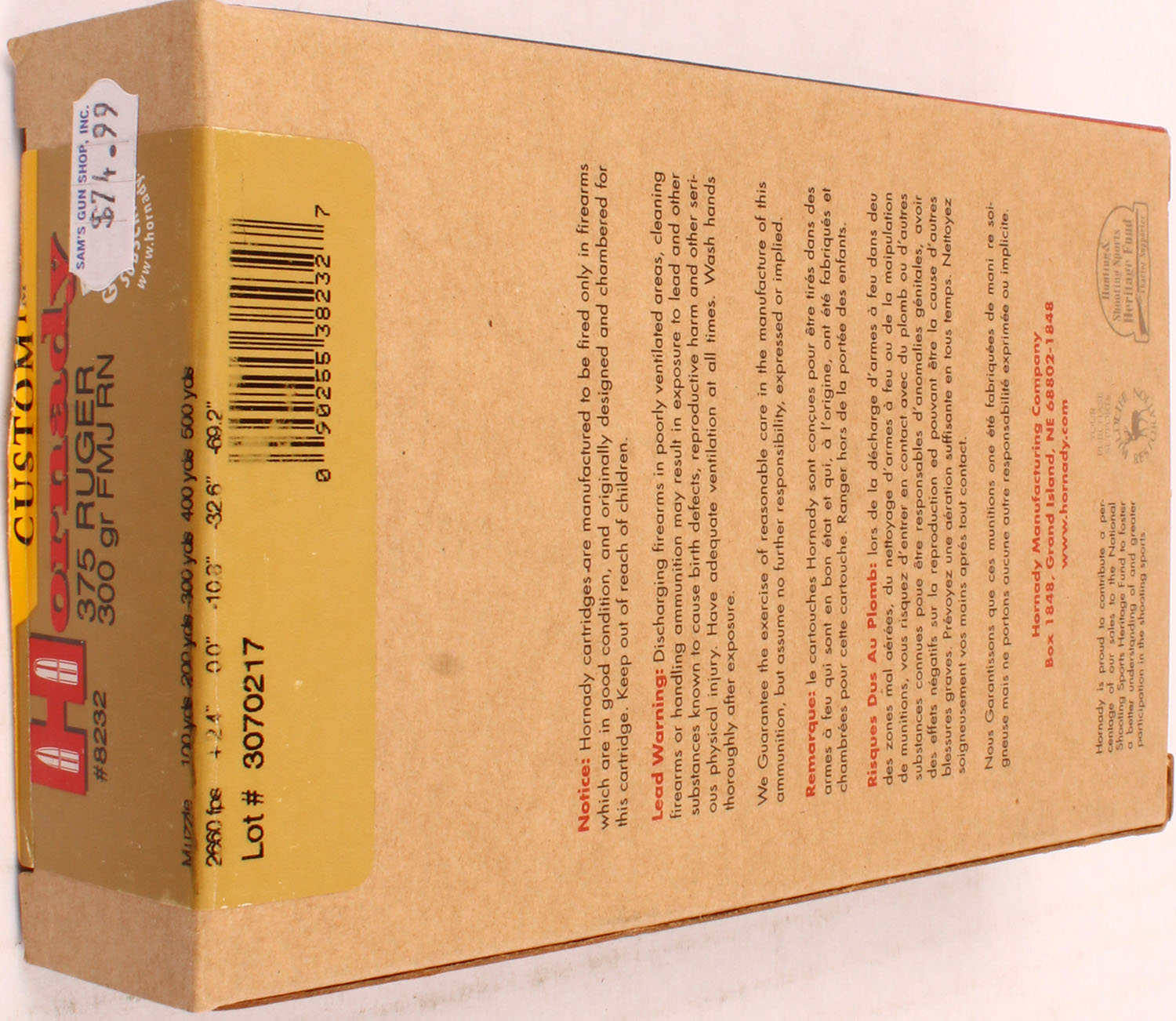 Hornady, Custom, 375 Ruger, 300 Grain FMJ RN, Full, 1pc. multi-colored box, box is solid with excellent color, Ammo is excellent. Grade: Excellent ++ - Value: 20 to 60