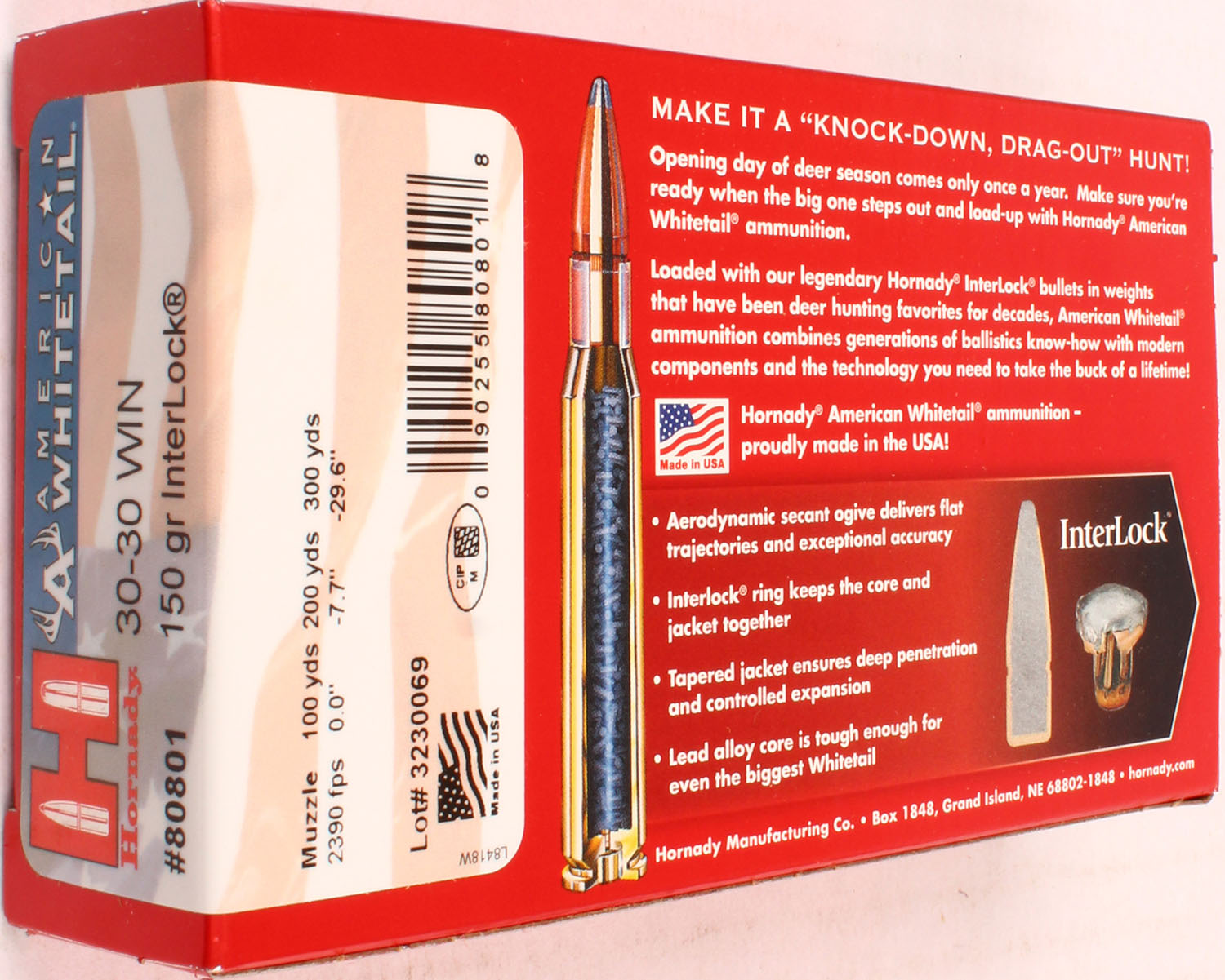 Hornady, American Whitetail, 30-30 Win, 150 Grain InterLock, Full, 1pc. multi-colored box, box is solid with excellent color, Ammo is excellent. Grade: Excellent ++ - Value: 20 to 60