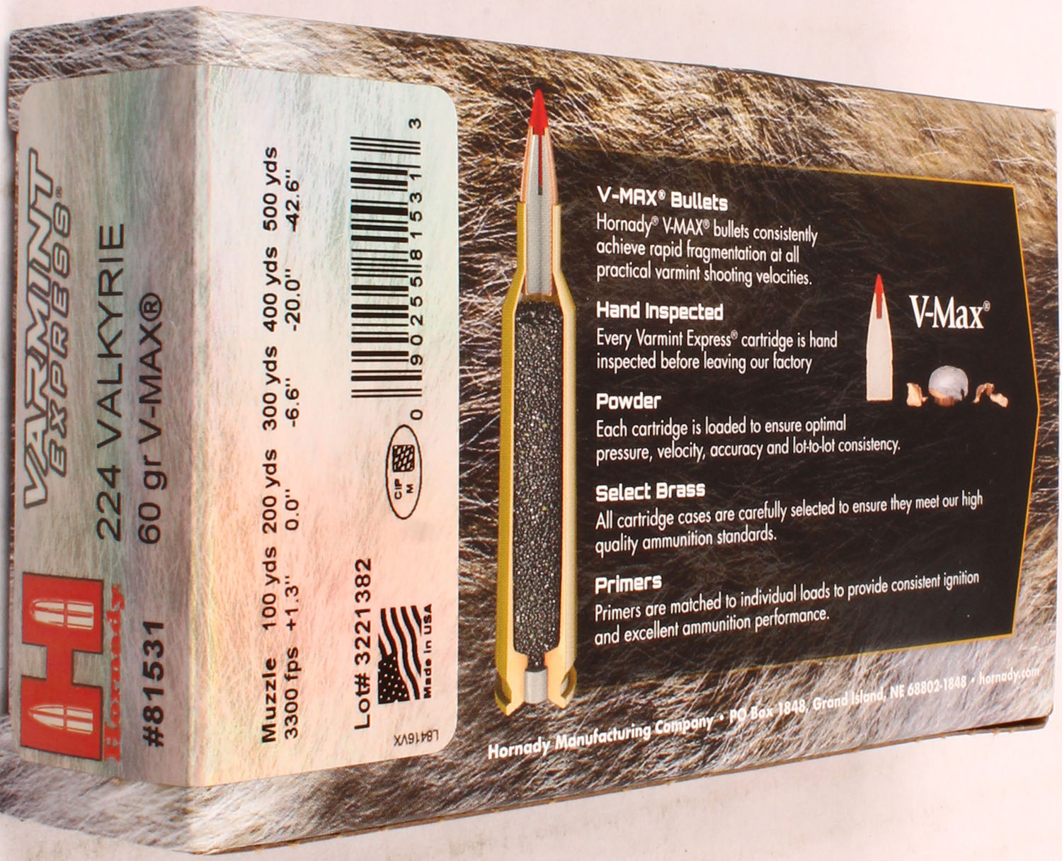 Hornady, Varmint Express, 224 Valkyrie, 60 Grain V-Max, Full, 1pc. multi-colored box, box is solid with excellent color, Ammo is excellent. Grade: Excellent ++ - Value: 20 to 60