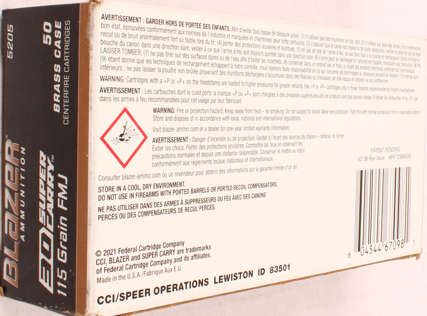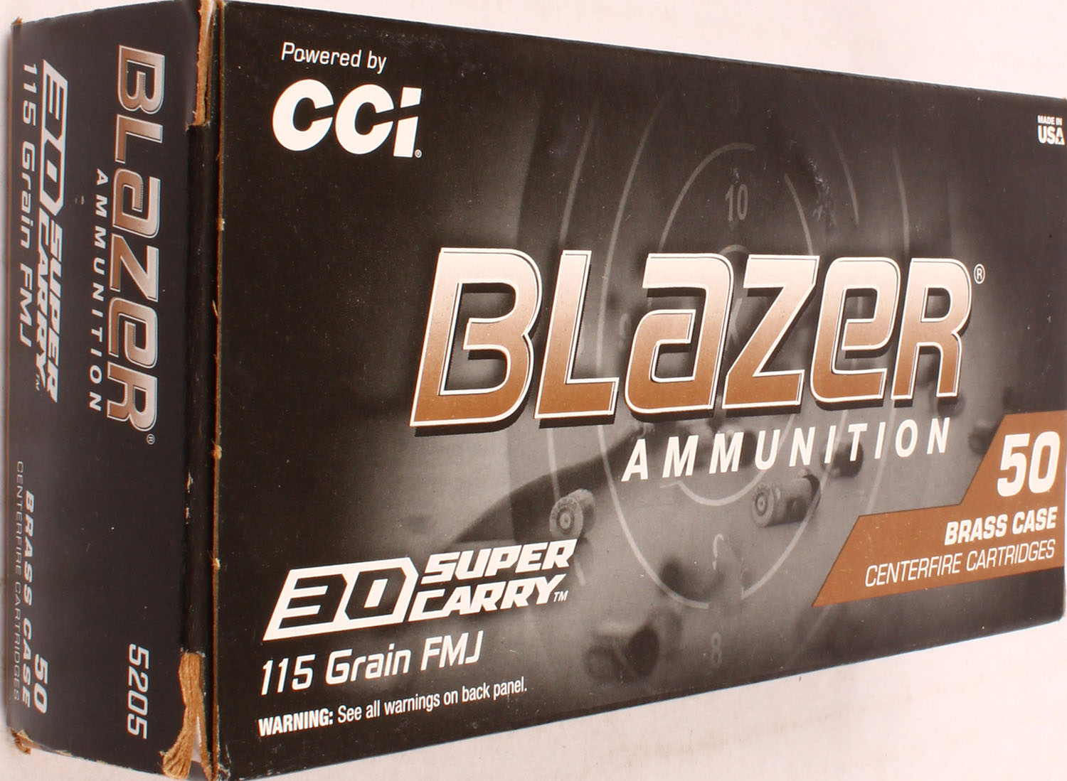 CCI, Blazer Brass, 30 Super Carry, 115 Grain FMJ, Full, 1pc. multi-colored box, box is solid with excellent color, Ammo is excellent. Grade: Excellent ++ - Value: 20 to 60