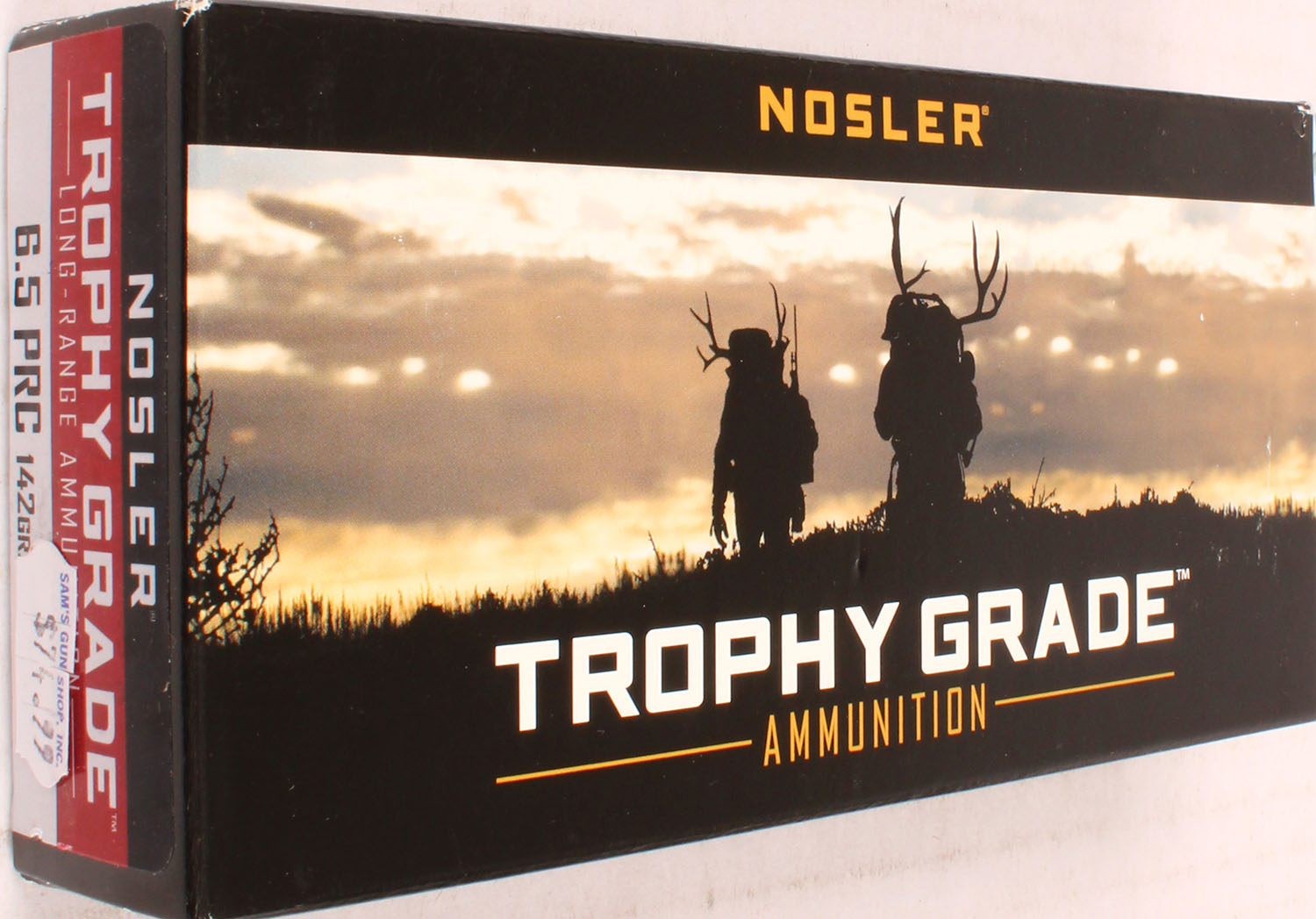 Nosler, Trophy Grade, 6.5 PRC, 142 Grain ABLR, Full, 1pc. multi-colored box, box is solid with excellent color, Ammo is excellent. Grade: Excellent ++ - Value: 20 to 80