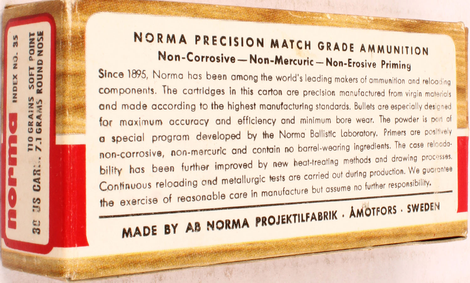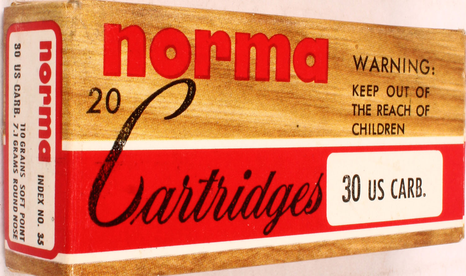 Norma, 30 US Carb., 110 Grains Soft Point, Full, 1pc. multi-colored box, box is solid with excellent color, Ammo is excellent. Grade: Excellent ++ - Value: 20 to 60