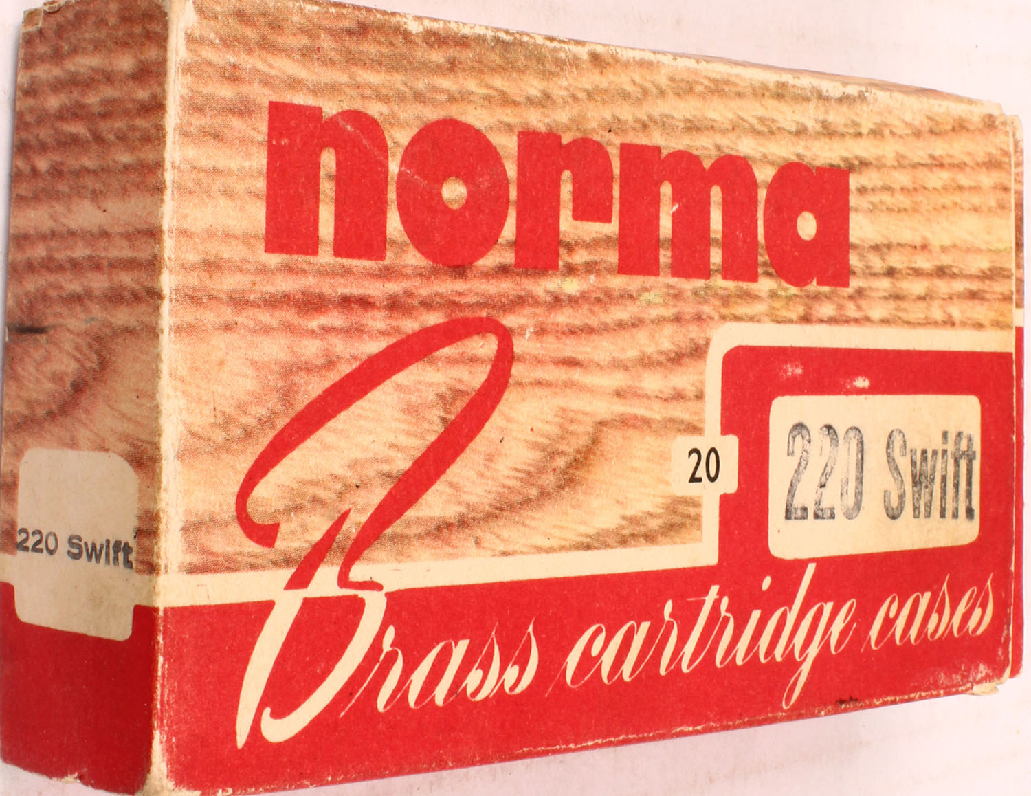 Norma, 220 Swift, Primed Brass, Full, 1pc. multi-colored box, box is solid with very nice color, Ammo is excellent. Grade: Excellent - Value: 20 to 60