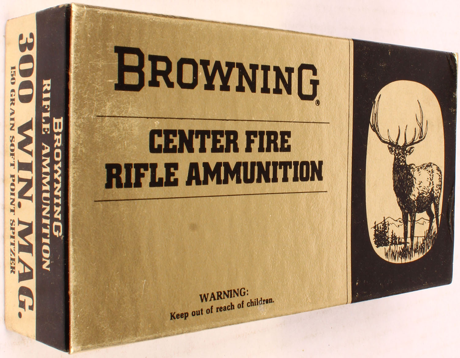 Browning with Insert, 300 Win Mag, 150 Grain Soft Point Spitzer, Full, 1pc., multi-colored box, box is solid with light shelf wear, Ammo is excellent. Grade: Excellent + - Value: 20 to 80