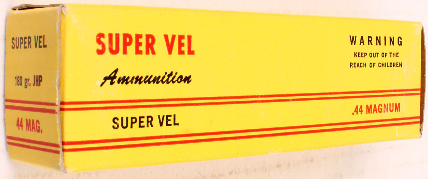 Super Vel, .44 Magnum, 180 Gr. JHP, 1pc, Full, yellow box with red/black print, box is solid with pen marks, rub marks, & light edge wear, ammo is excellent. Grade: Excellent - Value: 20 to 40