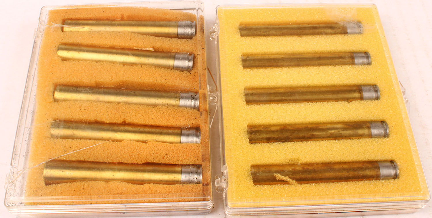 Lot of two, experimental cartridges, .50 cal & .40 cal, 10 Rds. In total, brass cases with steel case heads, no H/S, shells are excellent. Grade: Excellent - Value: 10 to 30