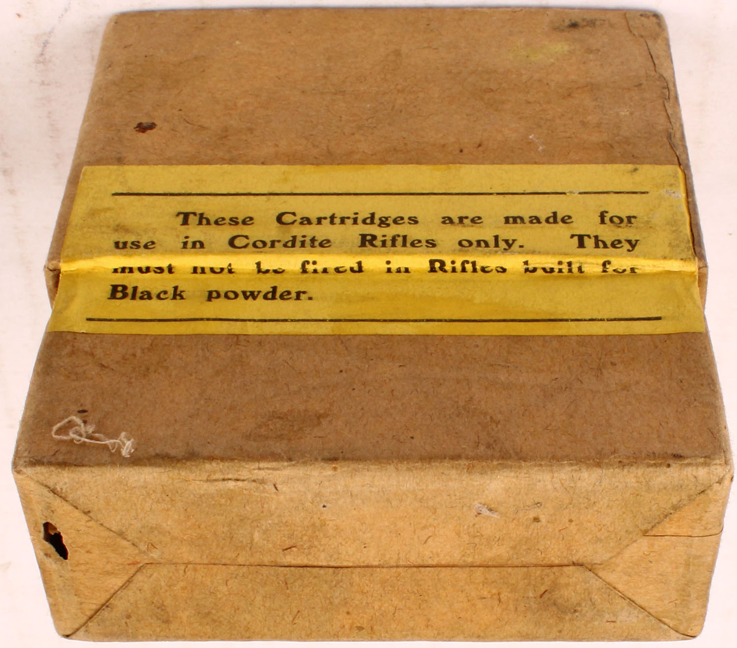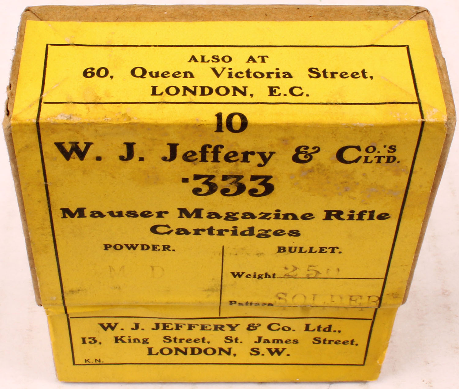 W.J. Jeffery & Co Ltd, .333 Mauser Magazine Rifle, 250 Gr. Solder Point bullet, 2pc, FULL & SEALED, buff box with yellow label & black print, box is solid with light age soiling, & rub marks. Grade: Very Good ++ - Value: 40 to 80