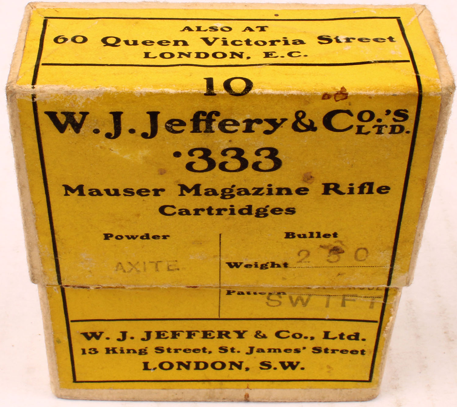W.J. Jeffery & Co Ltd, .333 Mauser Magazine Rifle, 250 Gr. swift bullet, 2pc, Full, buff box with yellow label & black print, box is solid with light age soiling, & rub marks. Ammo is good. Grade: Very Good ++ - Value: 40 to 80