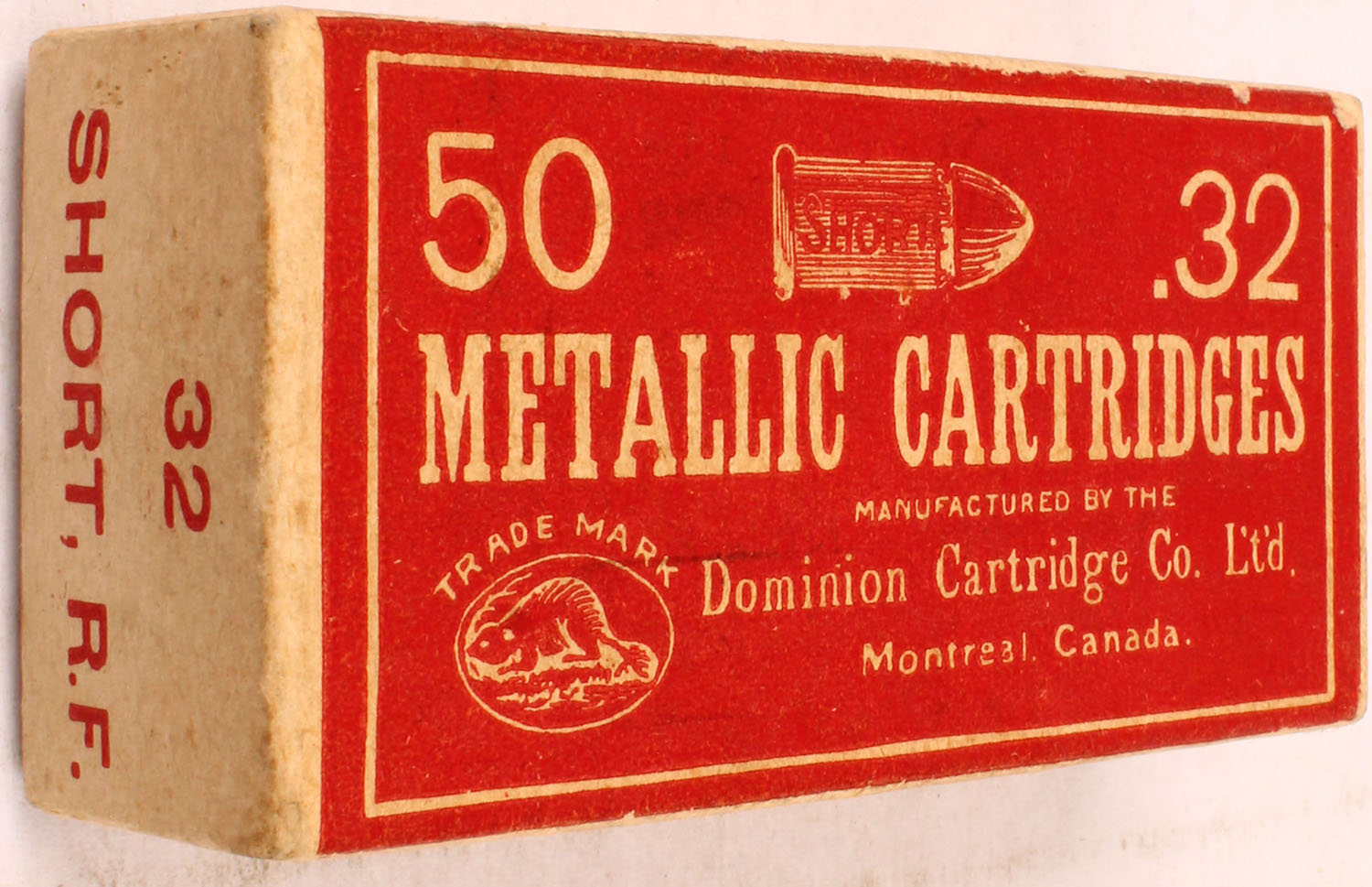 Dominion Cartridge Co. Ltd., .32 Short R.F., 2pc, FULL & SEALED, buff box with red label & white/red print, box is solid with light rub marks. Grade: Excellent ++ - Value: 100 to 200