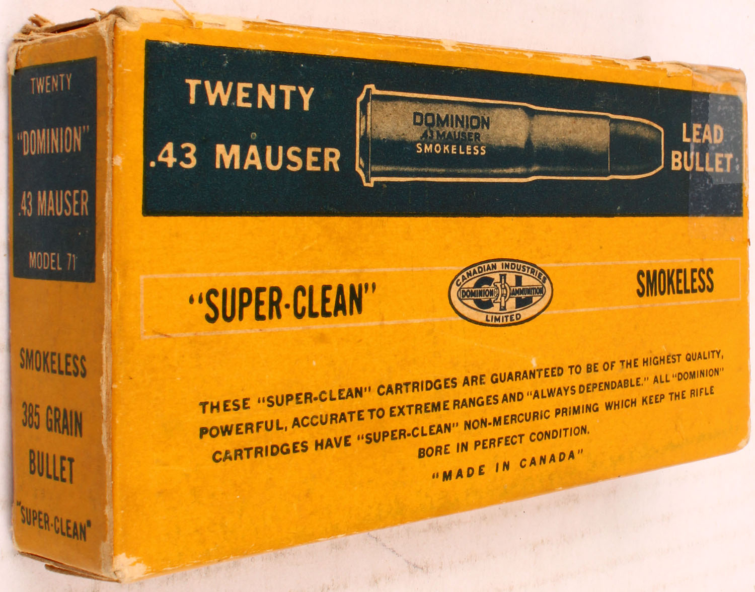 Dominion, .43 Mauser, Smokeless, Lead Bullet, 1pc, Full, yellow box with blue label & white/blue print, box is solid with one inside flap missing, tape, light rub marks, edge wear, & light age soiling ammo is very good. Grade: Very Good + - Value: 30 to 60