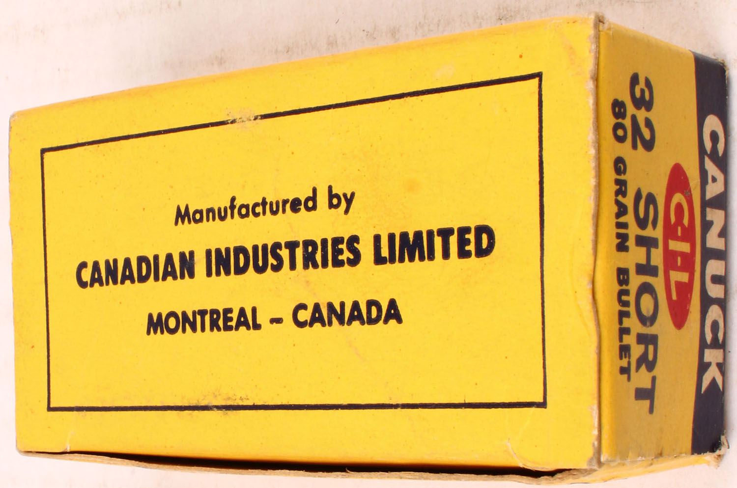 C-I-L, Canuck, .32 Short, 80 Gr. Bullet, 1pc, Full, yellow box with blue label & white/yellow print, box is solid with handling wear, & light age soiling, ammo is very good. Grade: Excellent - Value: 100 to 200