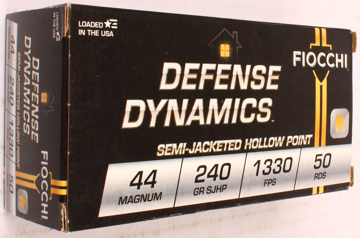 Fiocchi, Defense Dynamics, .44 Mag, 240 Gr. SJHP, 1pc, Full, black box with gold/gray/black print, box is solid with handling wear, ammo is MINT. Grade: Excellent ++ - Value: 40 to 80