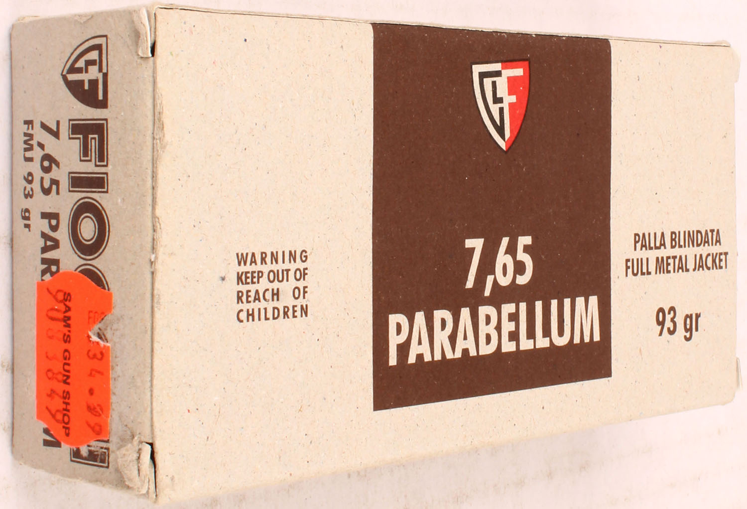 Fiocchi, 7.65 Parabellum, 93 Gr. FMJ Bullet, 1pc, Full, gray box with brown label & white/brown print, box is solid with light wear ammo is MINT. Grade: Excellent ++ - Value: 30 to 60