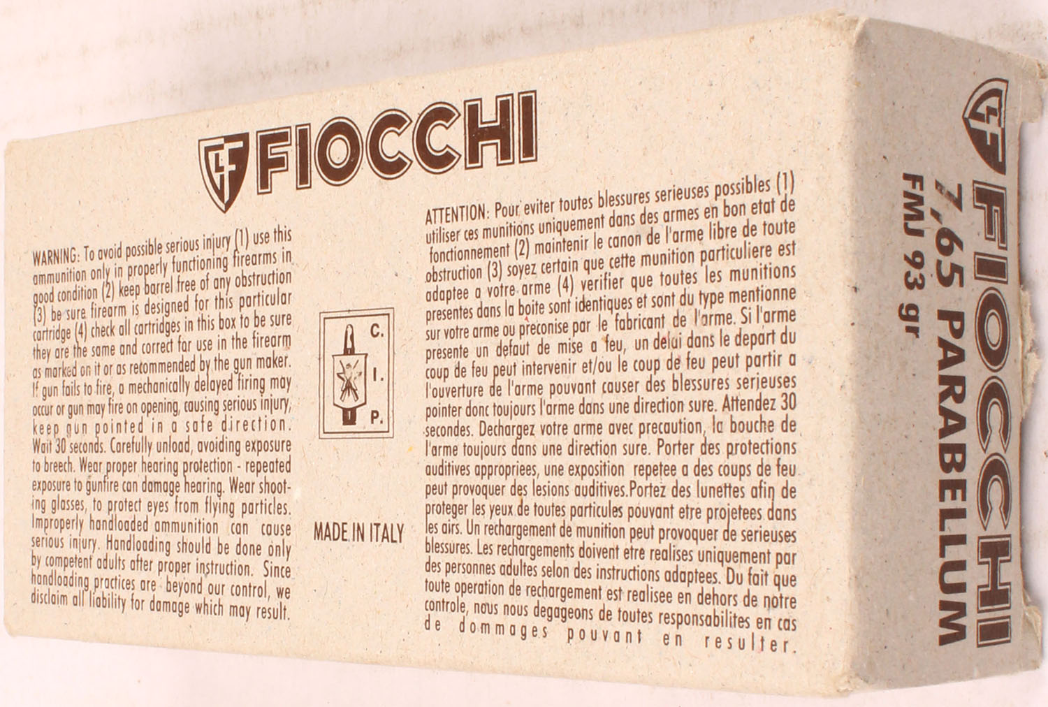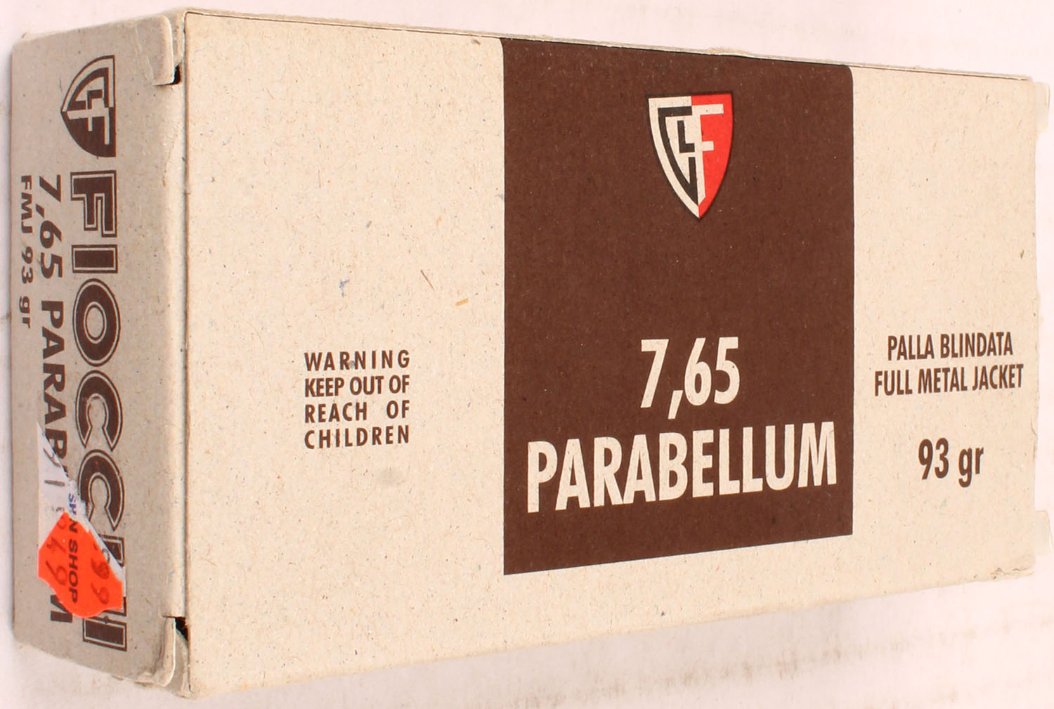 Fiocchi, 7.65 Parabellum, 93 Gr. FMJ Bullet, 1pc, Full, gray box with brown label & white/brown print, box is solid with light wear ammo is MINT. Grade: Excellent ++ - Value: 30 to 60