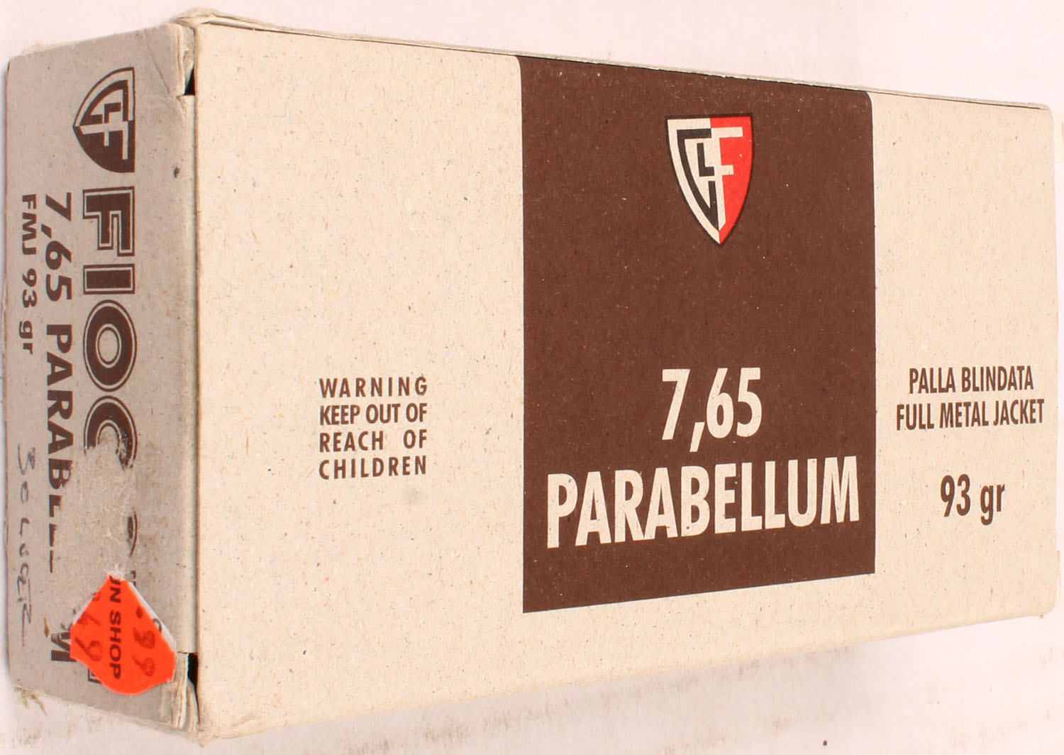 Fiocchi, 7.65 Parabellum, 93 Gr. FMJ Bullet, 1pc, Full, gray box with brown label & white/brown print, box is solid with light wear ammo is MINT. Grade: Excellent ++ - Value: 30 to 60
