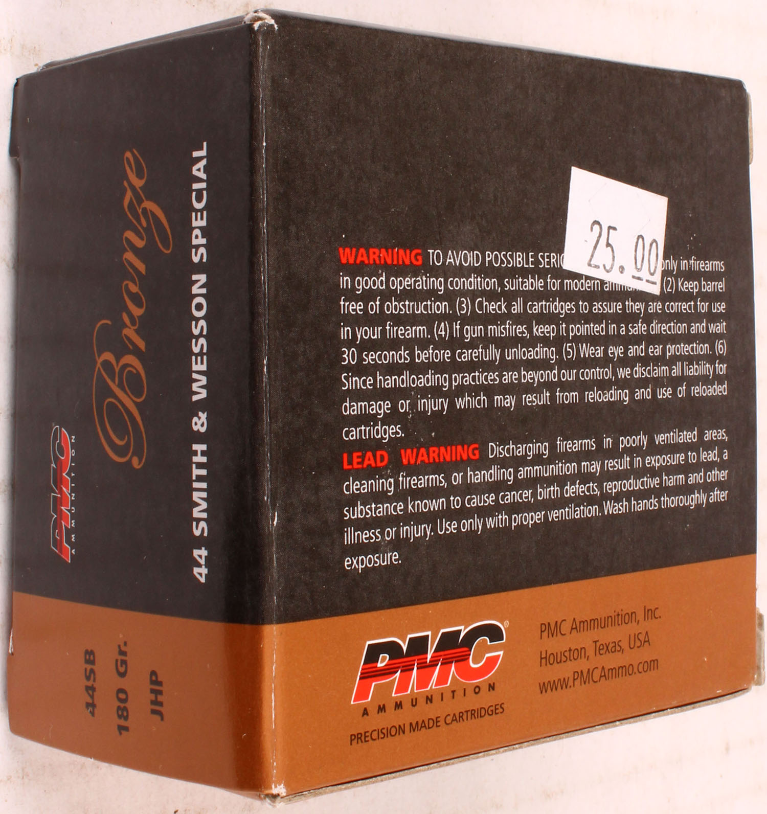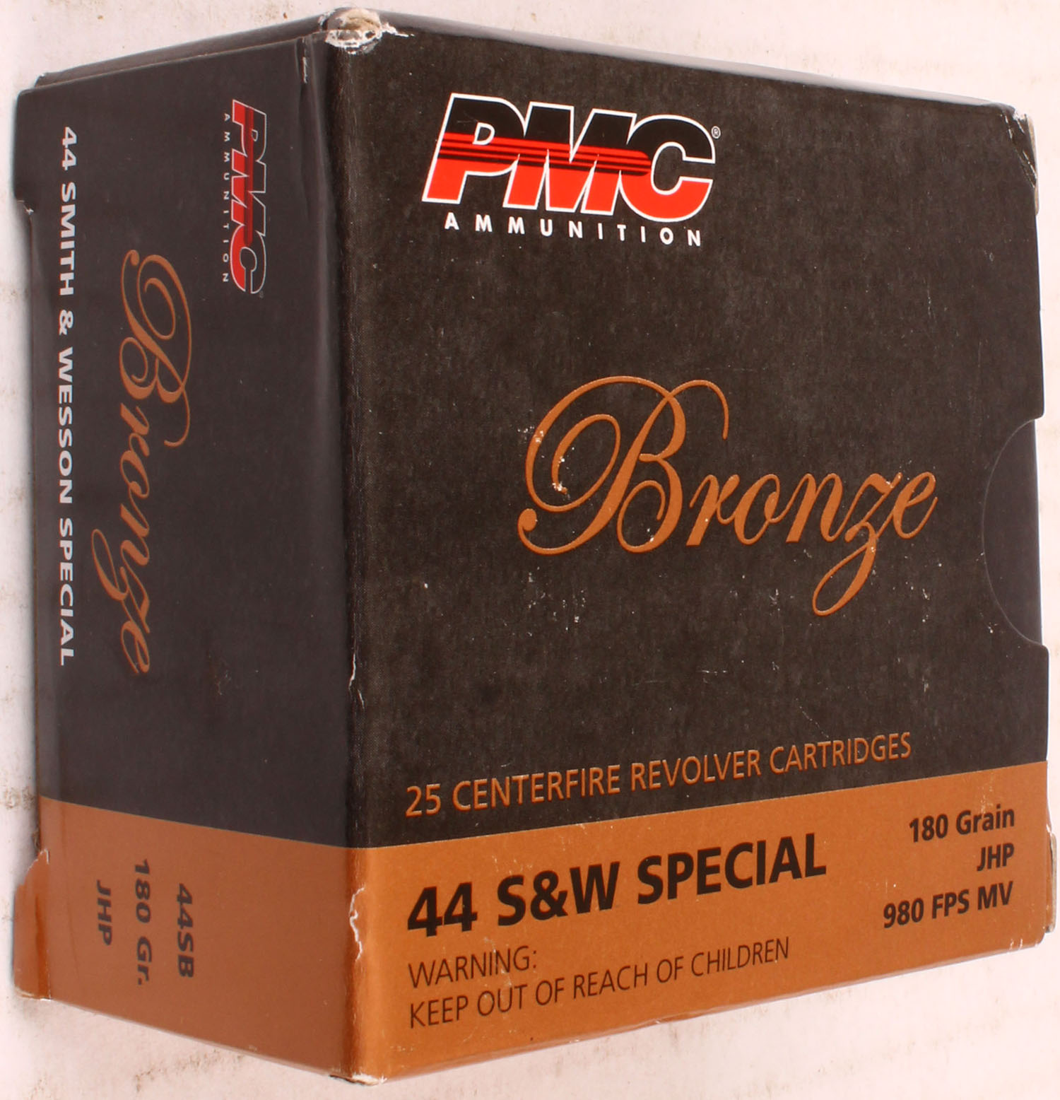 PMC, Bronze, 44 S&W Special, 180 Grain JHP, Full, 1pc., multi-colored box, box is solid with excellent color, Ammo is excellent. Grade: Excellent ++ - Value: 20 to 60