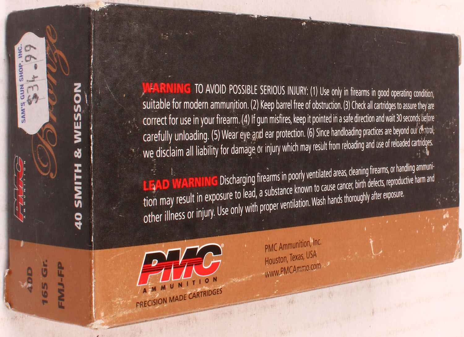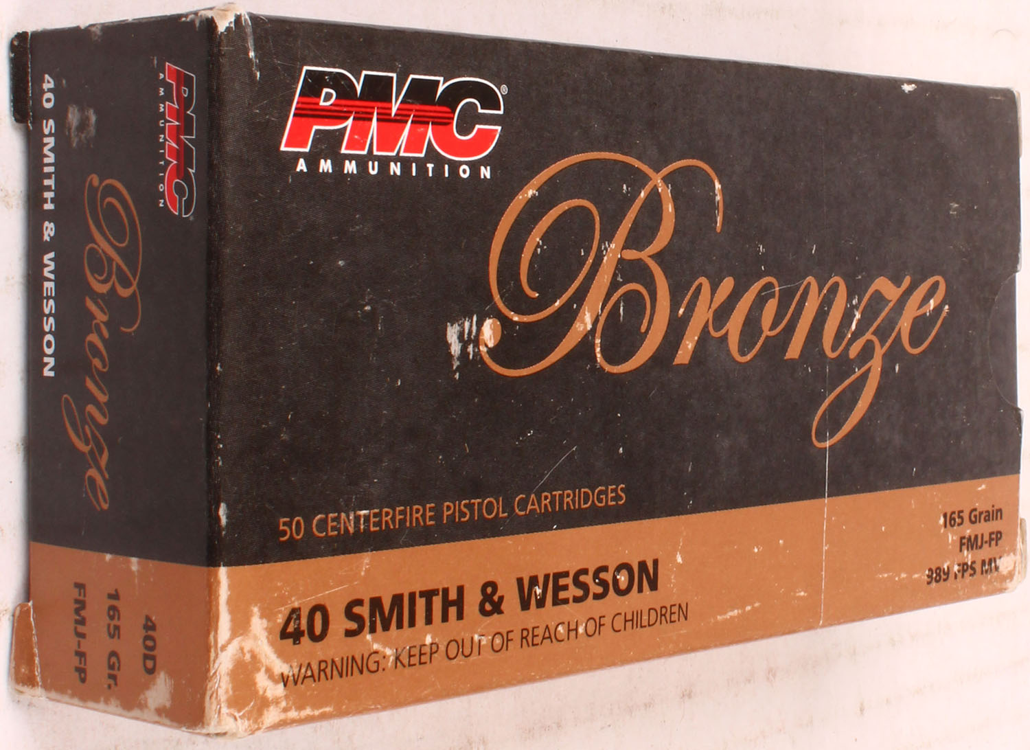 PMC, Bronze, 40 Smith & Wesson, 165 Grain FMJ-FP, Full, 1pc., multi-colored box, box is solid with excellent color, Ammo is excellent. Grade: Excellent ++ - Value: 20 to 60