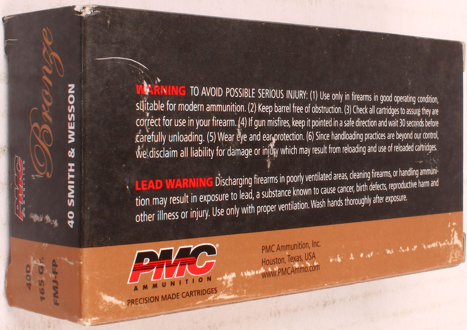 PMC, Bronze, 40 Smith & Wesson, 165 Grain FMJ-FP, Full, 1pc., multi-colored box, box is solid with excellent color, Ammo is excellent. Grade: Excellent ++ - Value: 20 to 60