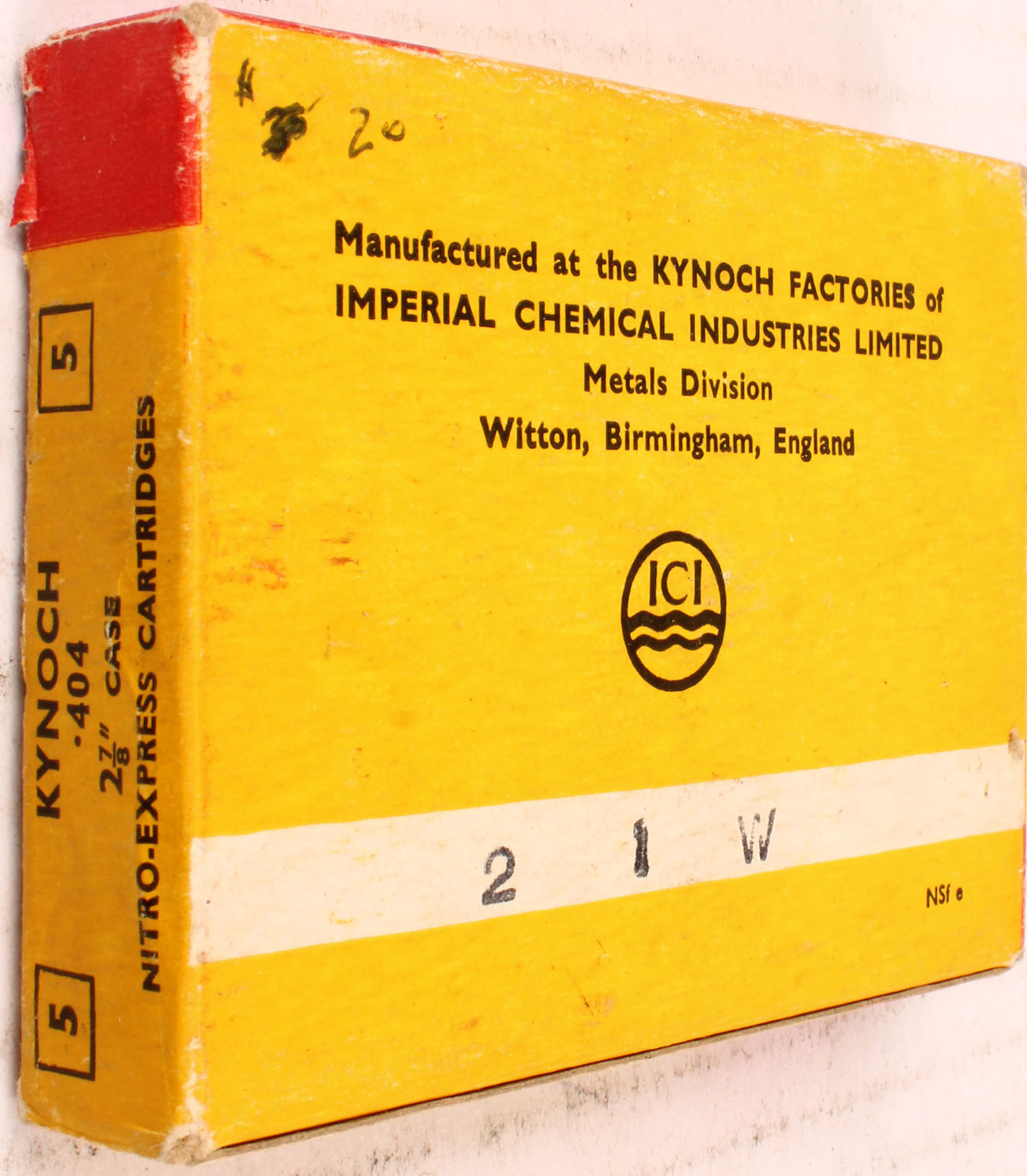 Kynoch, 404 Nitro-Express, 400 Grains Solid Bullet, Full, 1pc. Multi-colored box, box is solid with very nice color, Ammo is very good. Grade: Excellent - Value: 20 to 80