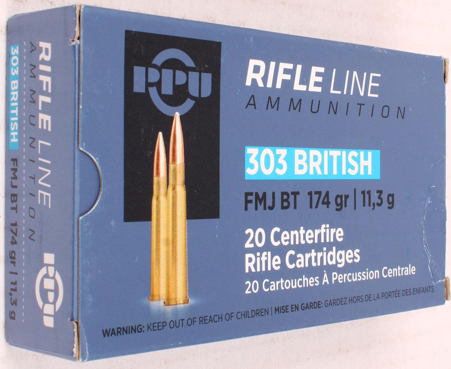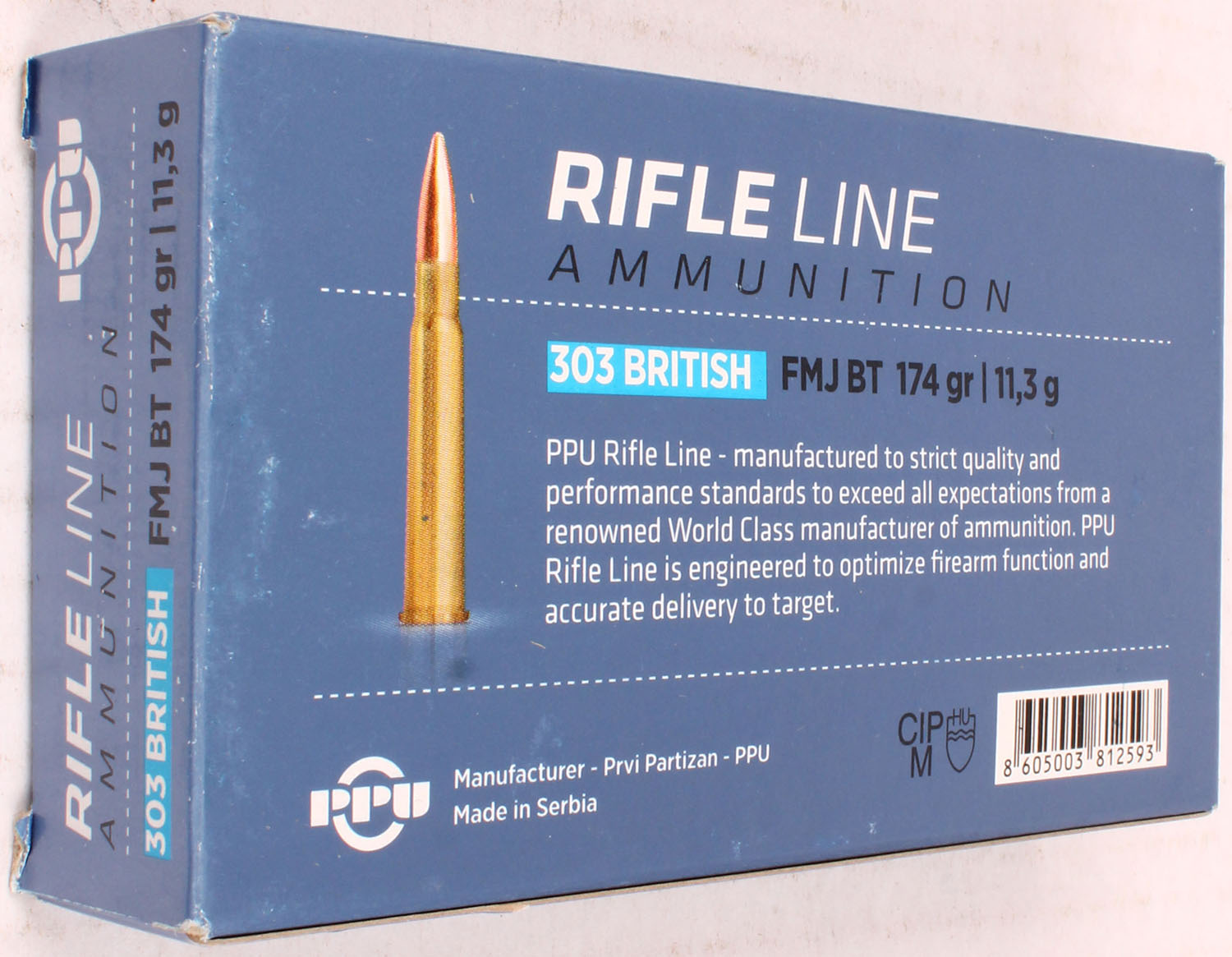 PPU, 303 British, 174 Grain FMJ BT, Full, 1pc. Multi-colored box, box is solid with excellent color, Ammo is excellent. Grade: Excellent + - Value: 20 to 60