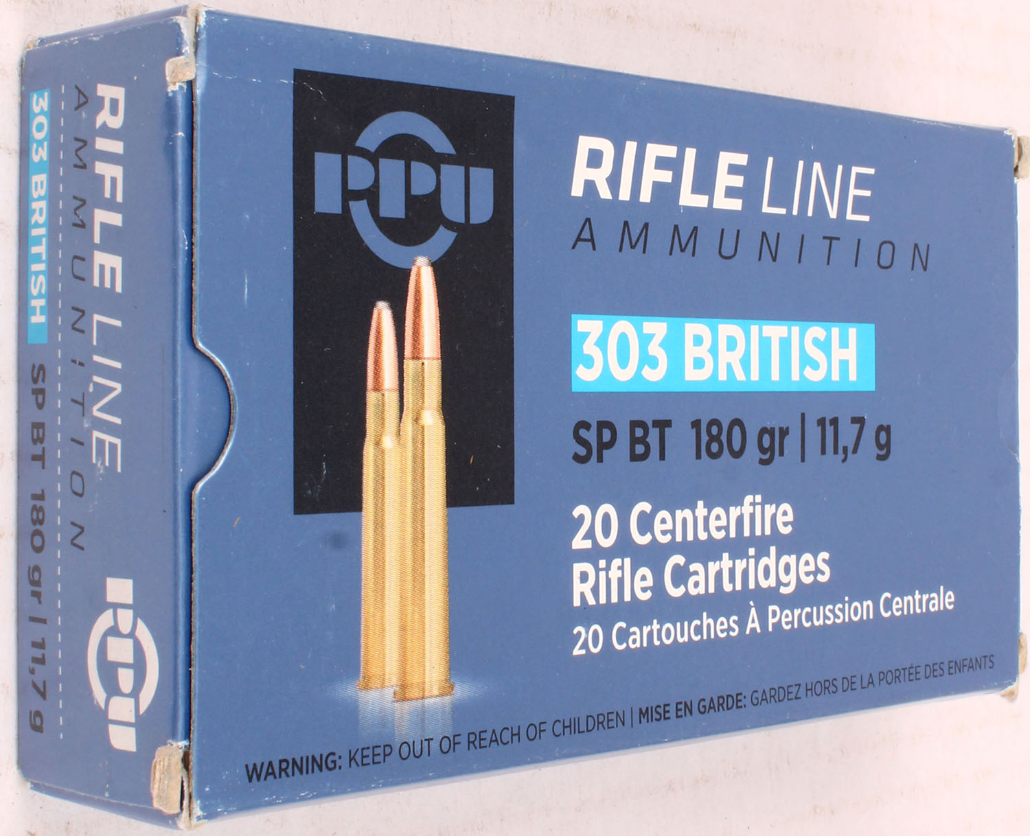 PPU, 303 British, 180 Grain SP BT, Full, 1pc. Multi-colored box, box is solid with excellent color, Ammo is excellent. Grade: Excellent + - Value: 20 to 60