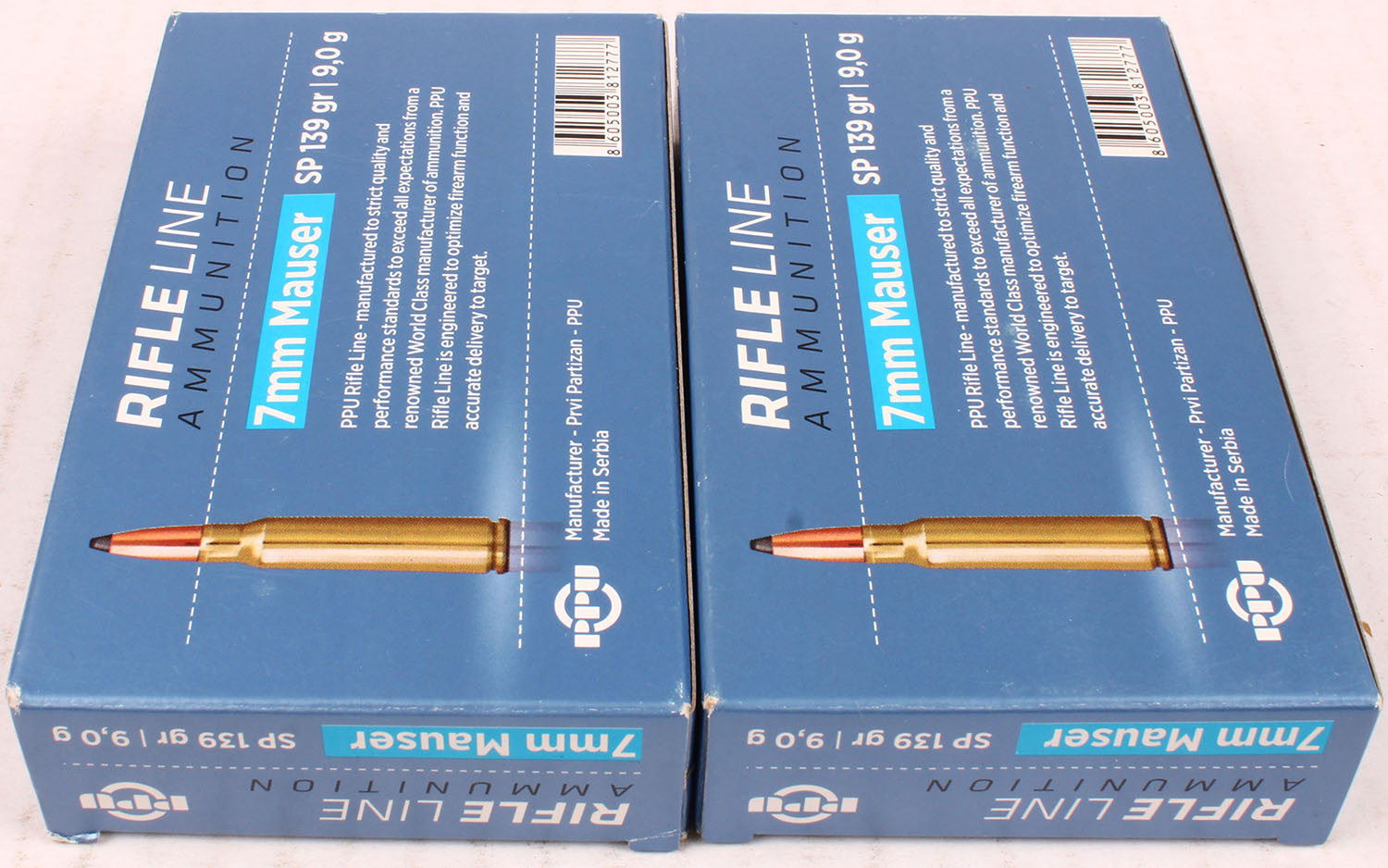 Lot of 2 PPU, 7mm Mauser, 139 Grain SP BT, Full, 1pc. Multi-colored box, box is solid with excellent color, Ammo is excellent. Grade: Excellent + - Value: 20 to 60