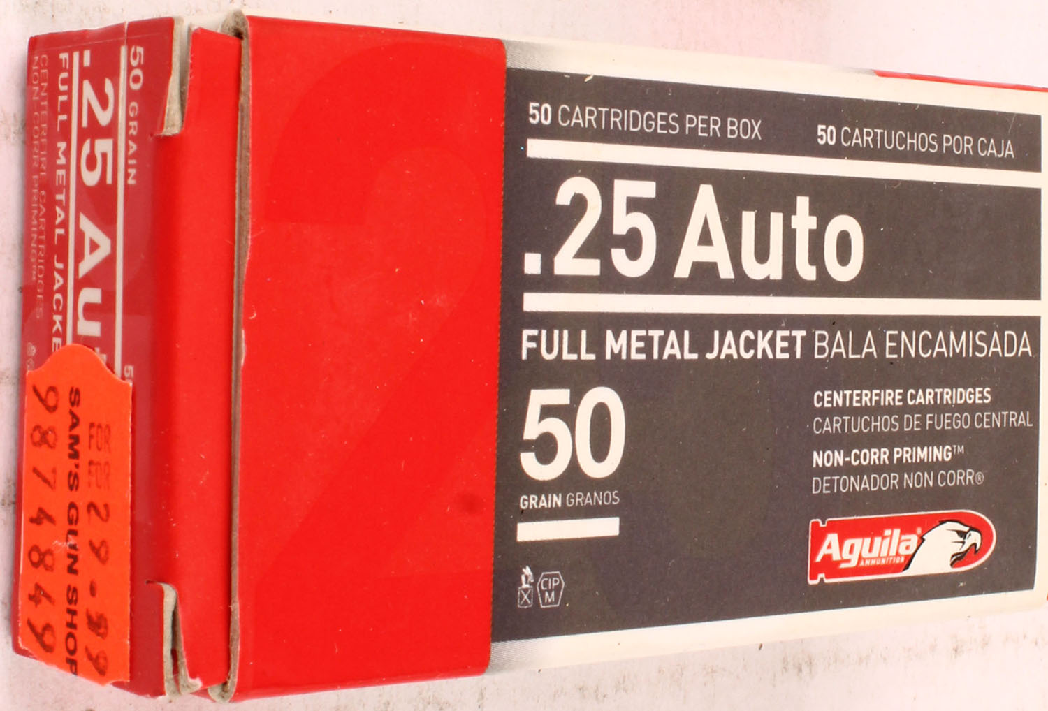 Aguila, 25 Auto, 50 Grain FMJ, Full, 1pc. Multi-colored box, box is solid with excellent color, Ammo is excellent. Grade: Excellent + - Value: 20 to 60