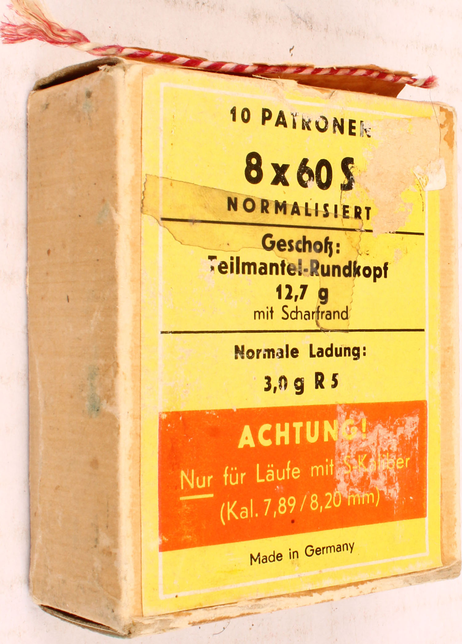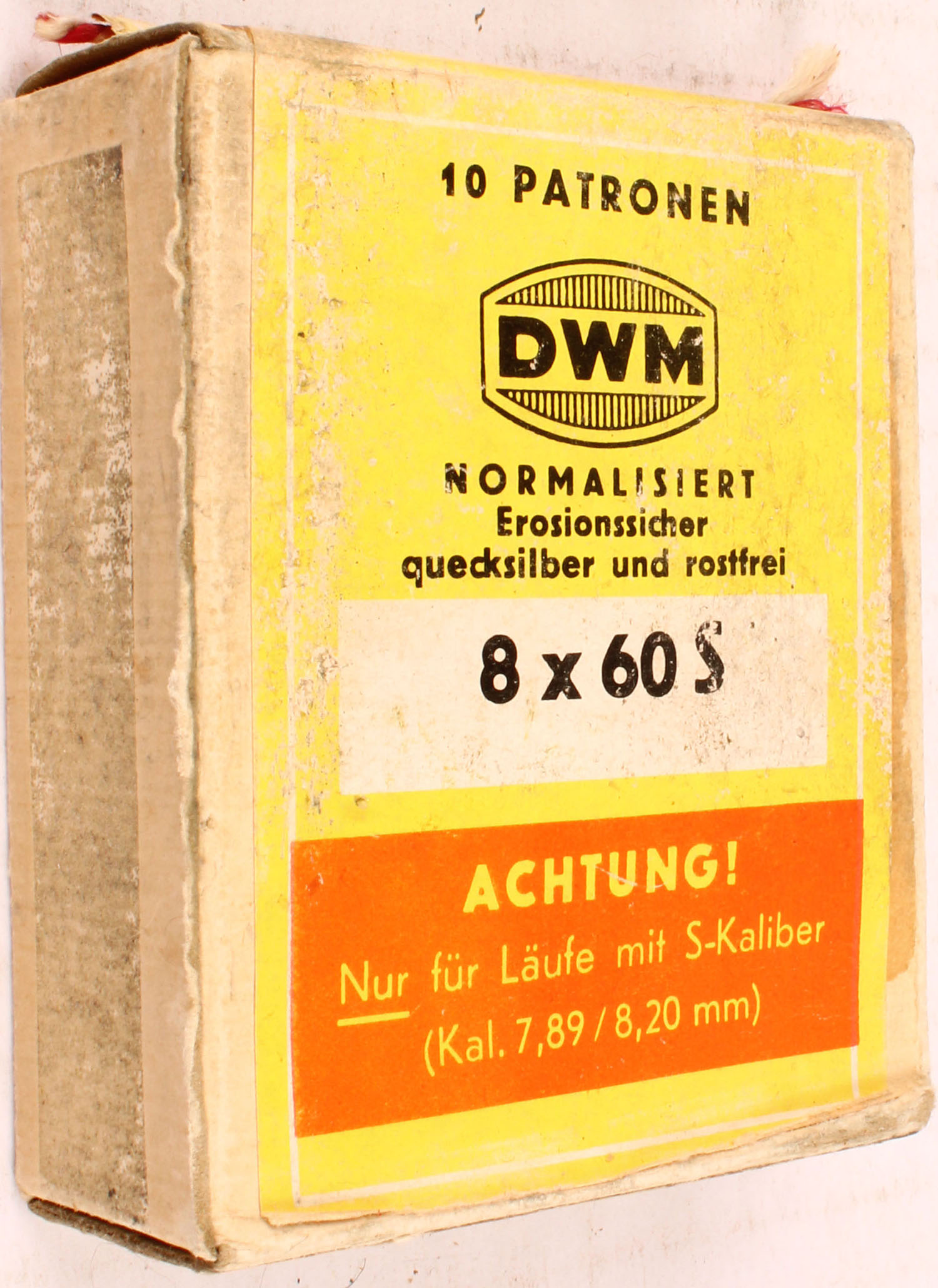 DWM, 8x60mmS, 12.7g/196 Grain Bullet, Full, 1pc. Buff box with yellow & orange label, box is solid with excellent color, very minor color fading, some shelf wear, tape residue on bottom, corner wear, some edge wear, flaps are solid, ammo is excellent. Grade: Very Good ++ - Value: 10 to 50