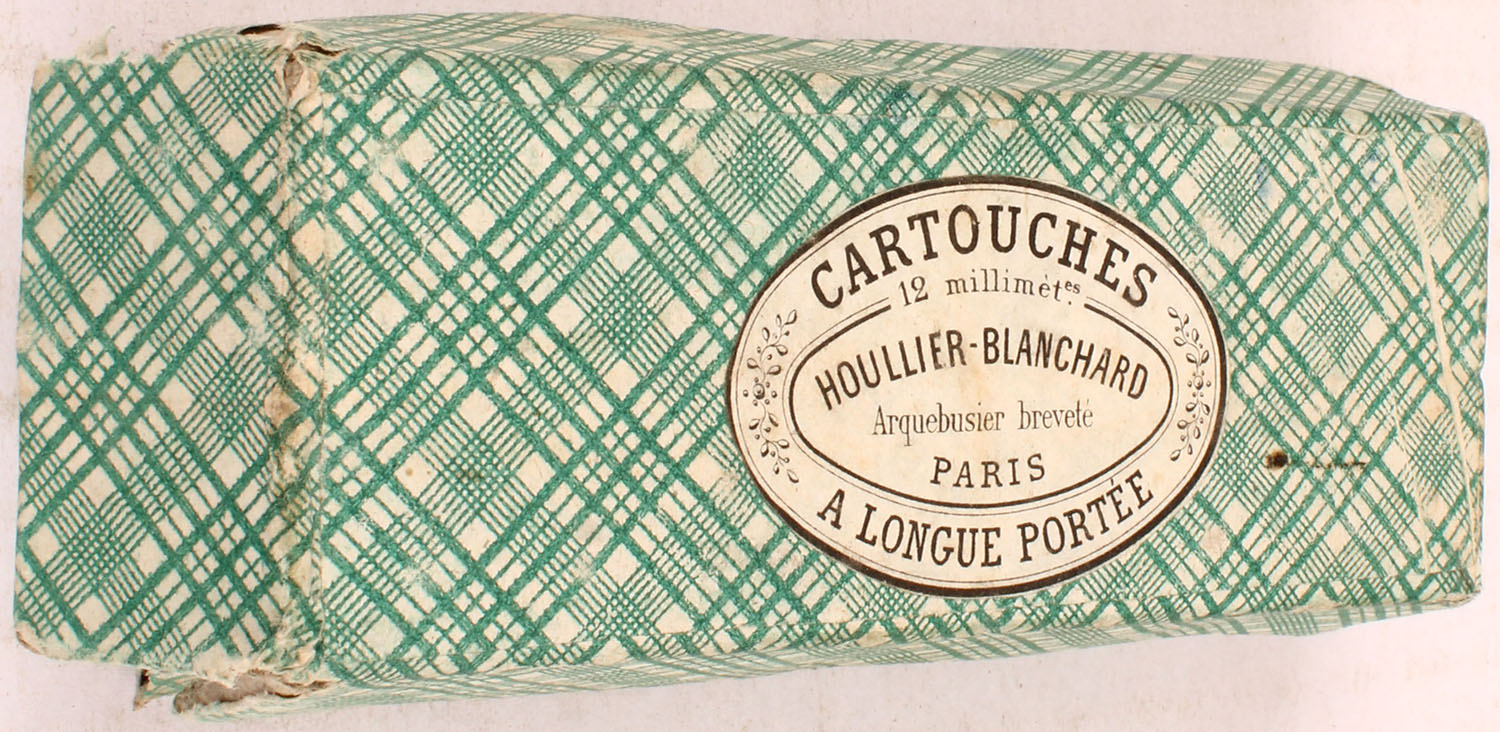 Houllier-Blanchard, 12mm Pin Fire, Full, 2pc. Green fabric box, box integrity is fully compromised with multiple seam splits, box has excellent color, ammo is very good. Grade: Good - Value: 40 to 120