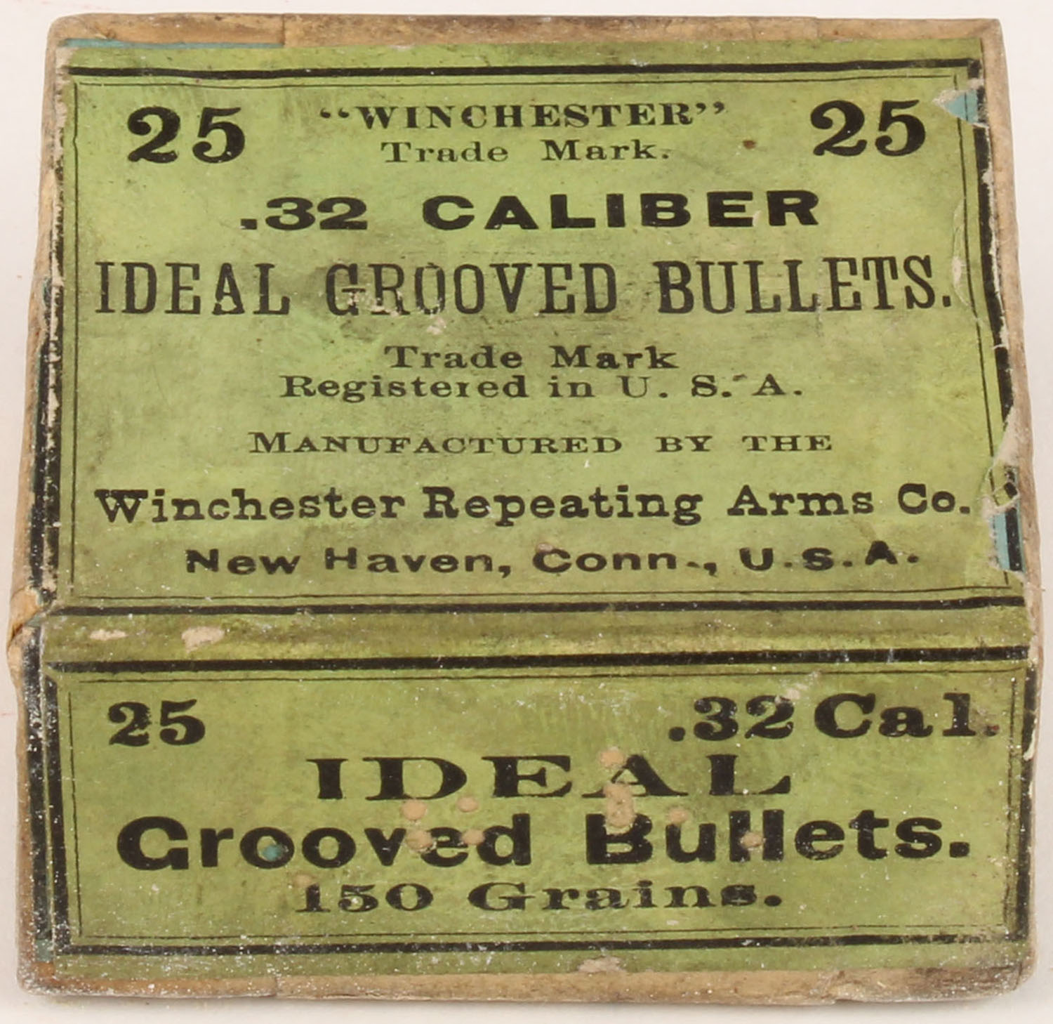 Winchester, .32 Caliber, 150 Grain Ideal Grooved Bullet, FULL & SEALED, 2pc. Buff box with green label, box is solid with very good to excellent color, some age soiling, very minor edge & corner wear, label is intact. Grade: Excellent + - Value: 30 to 90