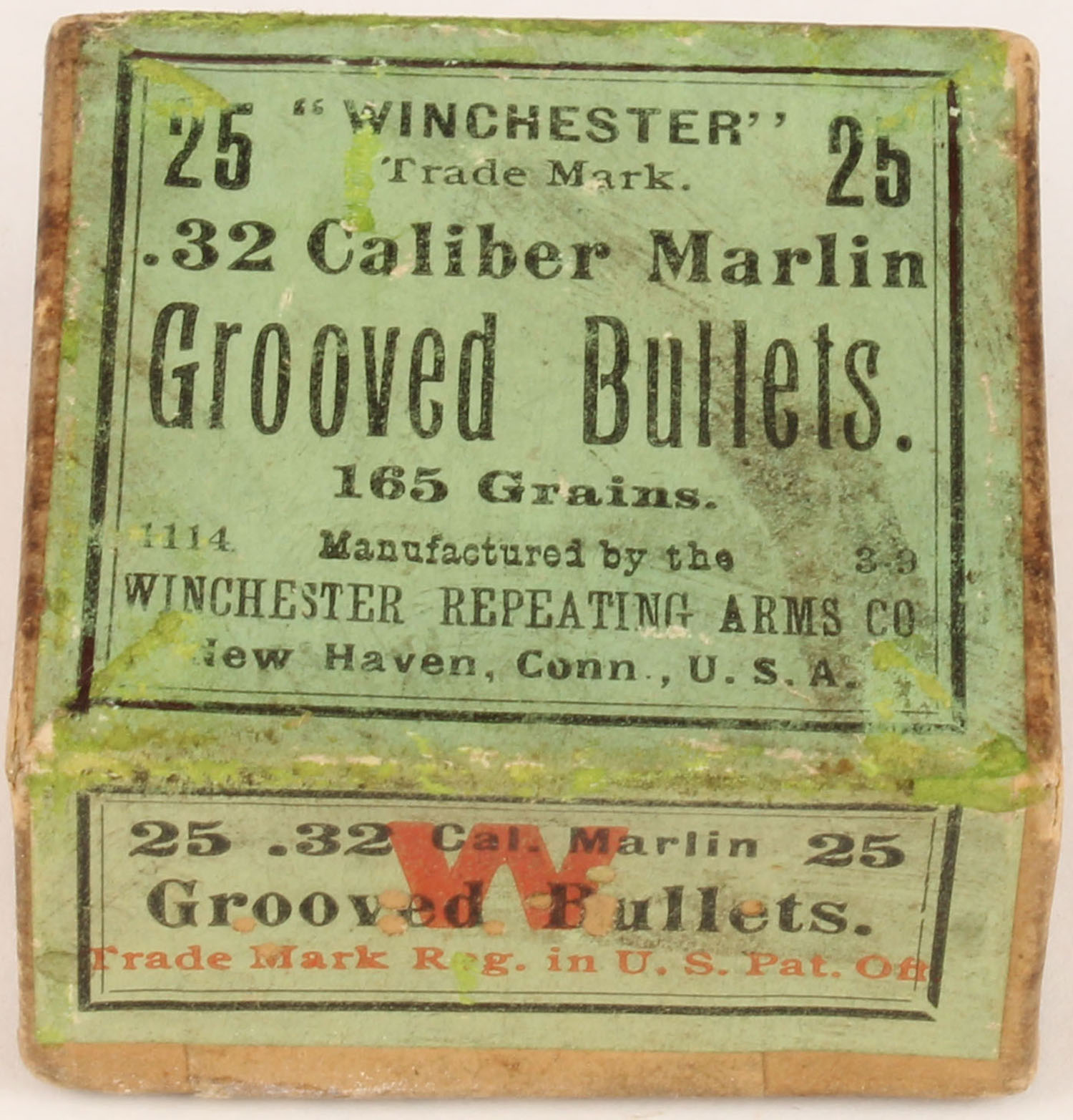 Winchester, .32 Caliber Marlin, 165 Grain Grooved Bullets, FULL & SEALED, 2pc. Buff box with green label, box is solid with excellent color, minor age soiling, very minor shelf & corner wear, edges are crisp, label is intact. Grade: Excellent + - Value: 20 to 60