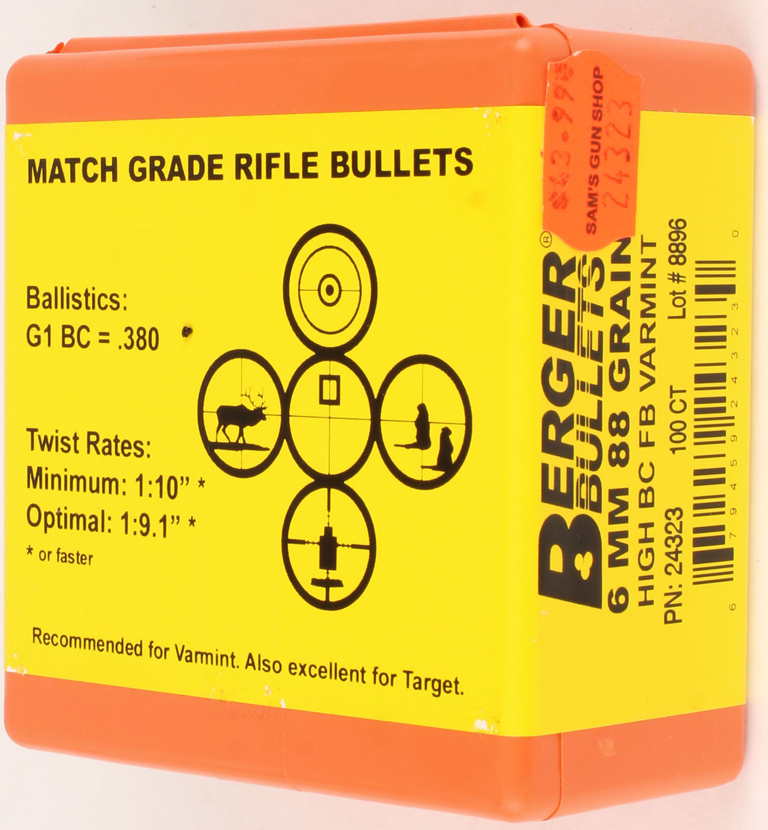 Berger, Match Grade Rifle Bullets, 6mm, 88 GR. High BC FB Varmint, FULL & SEALED, 1pc. Orange plastic box, box is MINT with minty color. Grade: MINT - Value: 10 to 40