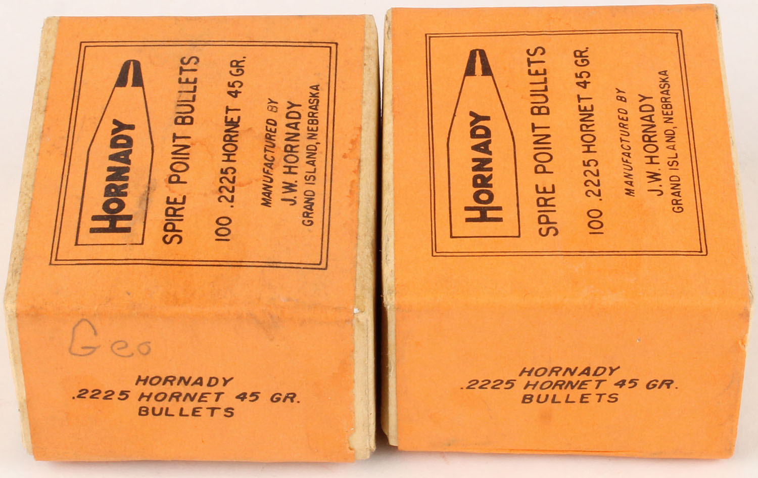 Lot of 2 Hornady, .2225 Hornet, 45 GR. Spire Point, FULL & SEALED/Partial, 1pc., buff box with orange & black label, box is MINT with minty color. Grade: Excellent + - Value: 10 to 60