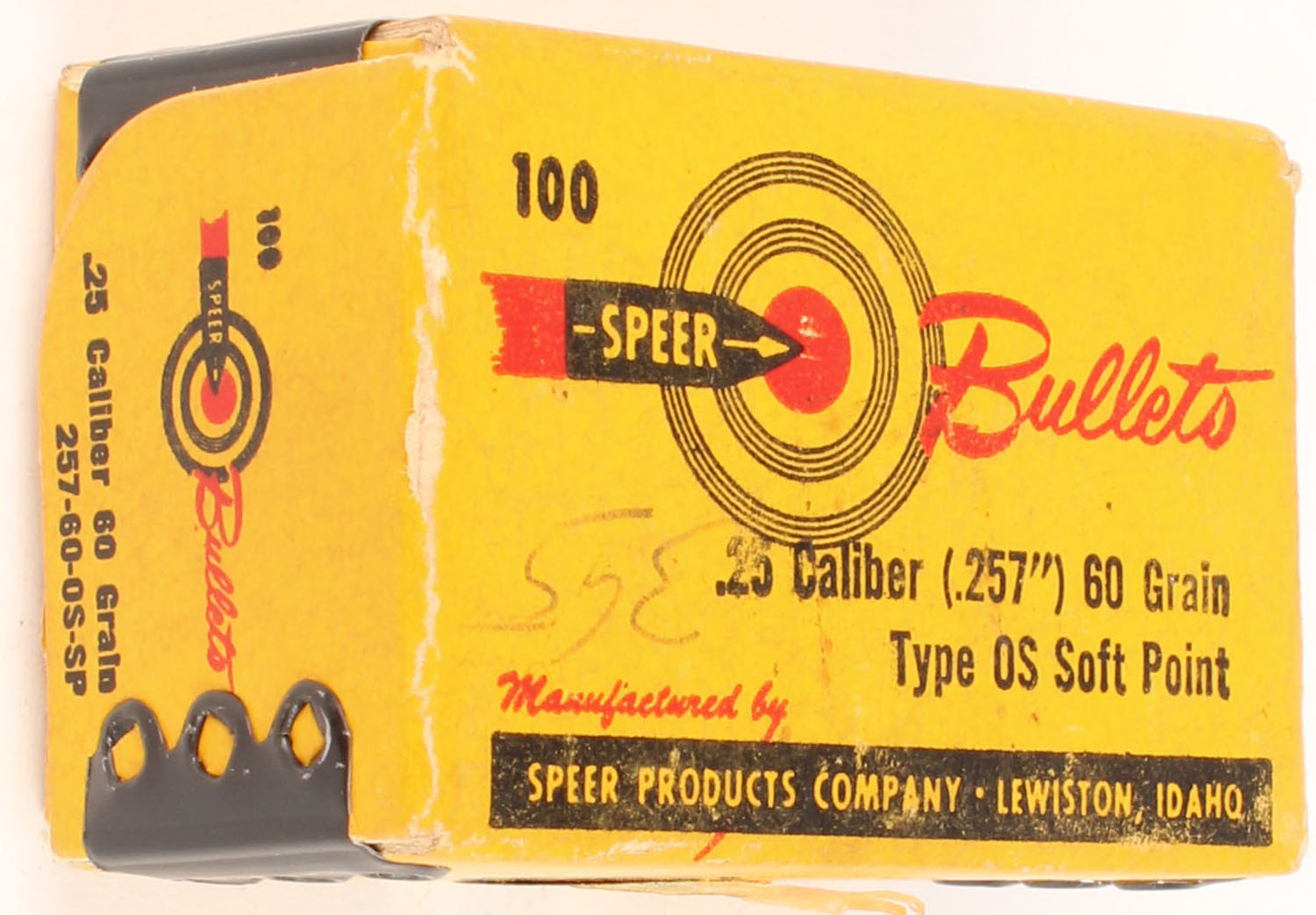 Speer, .25 Cal., 60 Grain Type OS Soft Point, FULL & SEALED, 1pc. Multi-colored box, box is solid with very good color. Grade: Excellent - Value: 10 to 40