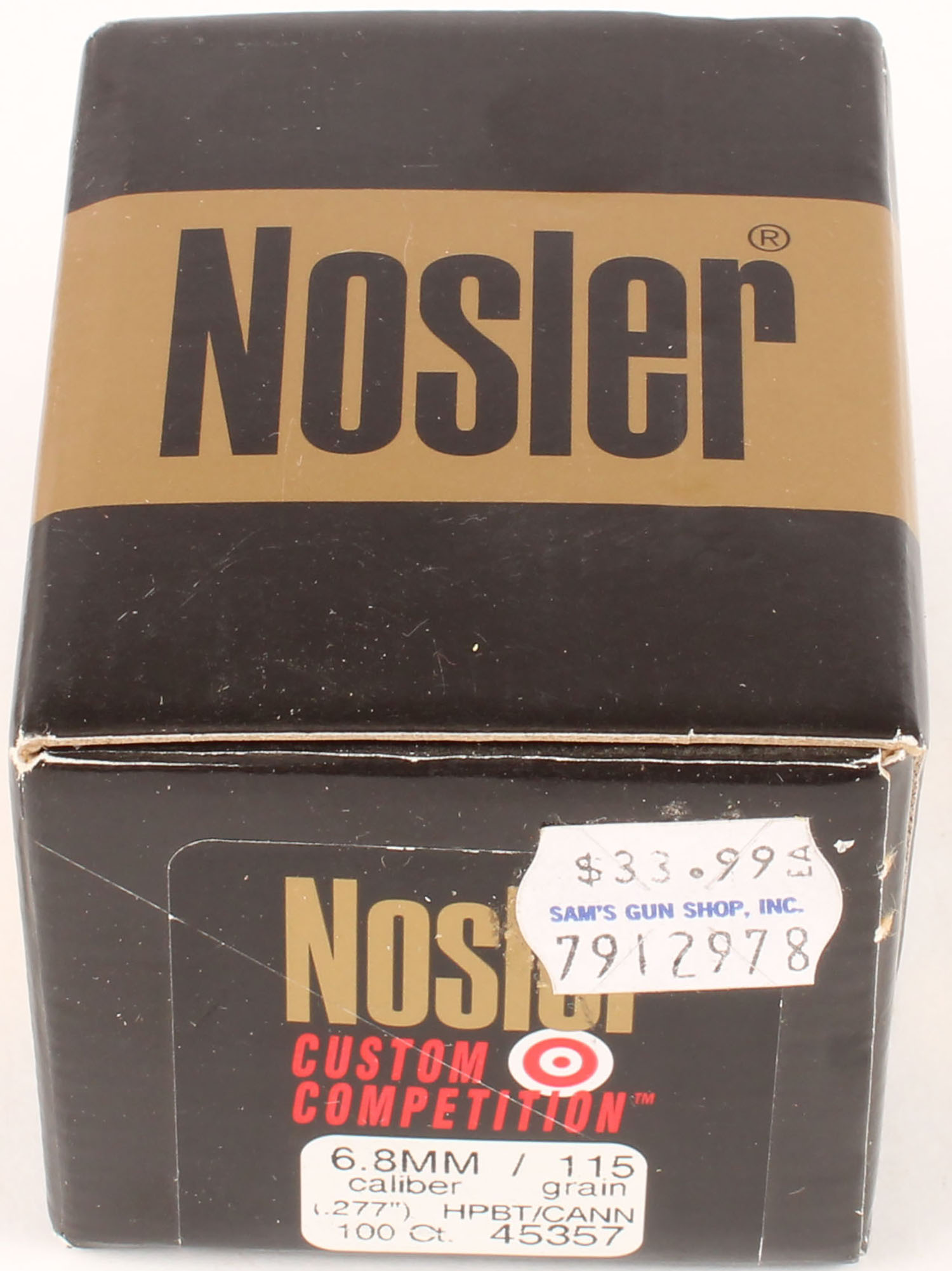 Nosler, 6.8mm, 115 Grs. HPBT/CANN, FULL & SEALED, 1pc., multi-colored box, box is solid with great colors. Grade: Excellent + - Value: 10 to 40