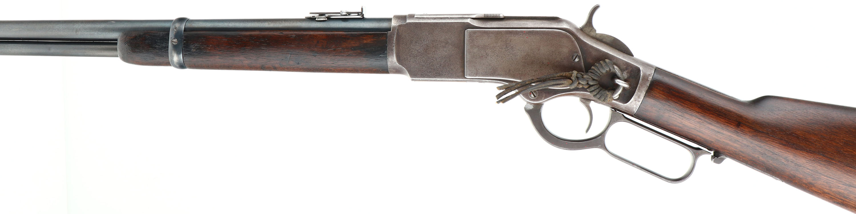 Winchester, Model 1873 Saddle Ring Carbine, 3rd model, .32 WCF Cal., MFG: 1897, SN: 509559B, Lever Action Carbine, 20'' Round barrel, Full mag. The original wood stocks are very good & solid, having been lightly sanded & refinished. The wood has a nice aged or darkened rich chocolate brown appearance. There are a few minor handling marks or rubs to the stock. The forend has a tight 4'' crack & a couple of tight 1'' grain cracks at the tip, along with minor contusions & scrapes. The original metal blue finish on the barrel & mag rates 85%. The receiver has worn gun metal gray, with a thin layer of brown patina present. Fitted with a flip-up ladder rear & box carbine front sights. Bore is excellent. Metal carbine butt. Original saddle ring, with leather lashing. Tight smooth action. Comes with a Cody Factory Records Letter confirming configuration & dates. A very nice & desirable Model 1873 SRC in the rarer 32 WCF.* Antique, No FFL Req. - Value: 5000 to 8000