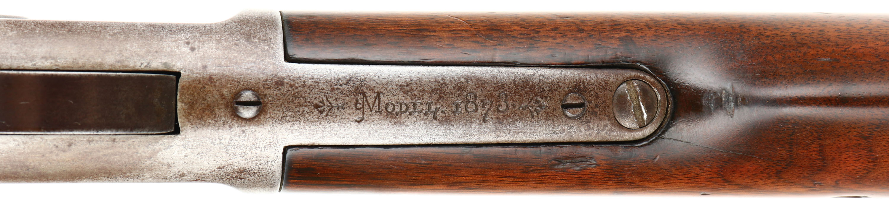 Winchester, Model 1873, 3rd Variation, Marked .32 W.C.F. Cal., MFG: 1889, SN: 322835B, Lever Action Rifle, 24'' Round barrel, Full mag. The original straight grip wood stock & forend are very good, having an added layer of finish over the original finish. There are several small contusions & minor scratches or scrapes. The metal blue finish has worn away to mostly gun metal gray, with a thin layer of brown patina. Bore is fair, appears dark, with pitting & roughness amongst thin rifling. The barrel holds an adjustable rear sight & pinched silver blade front sight. Stock carries a smooth crescent metal buttplate. Dust cover needs to be manually pulled to the rear for the lever to close & the rifle to fire. The rifle needs to visit a gunsmith for adjustment or repair before use, & is therefore selling AS-IS, with no returns. Comes with a Cody Winchester Factory Records Letter, which confirms dates & configuration. A solid & antique 1873, with a nice appearance. Antique, No FFL Req. - Value: 1500 to 3000