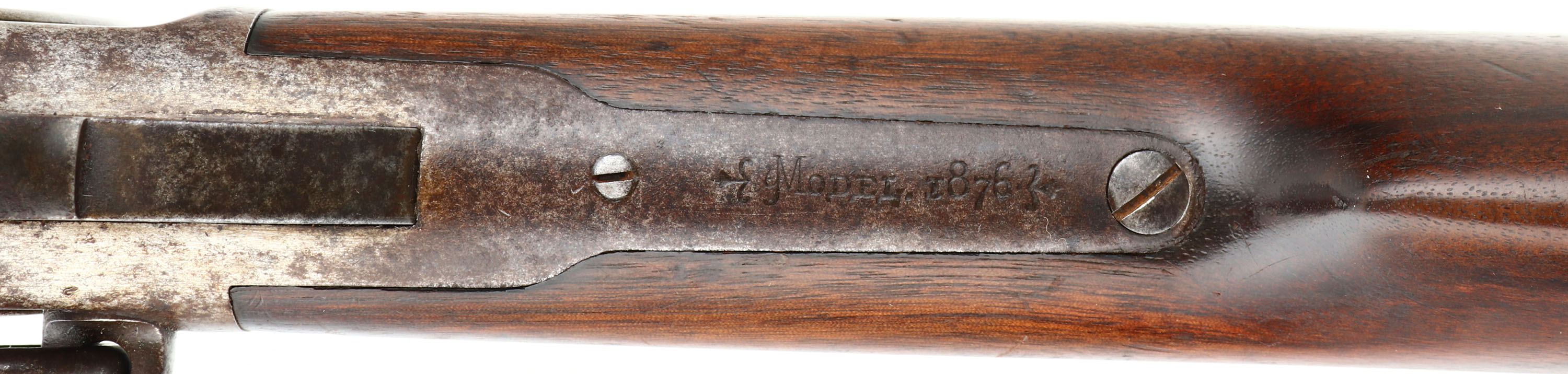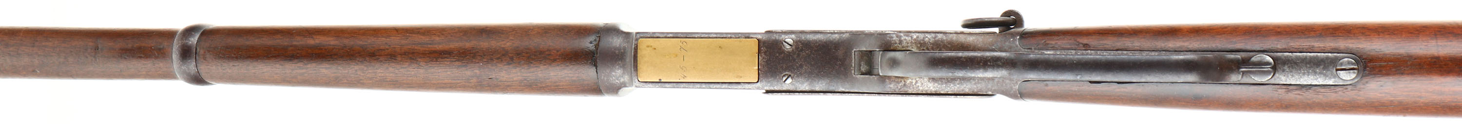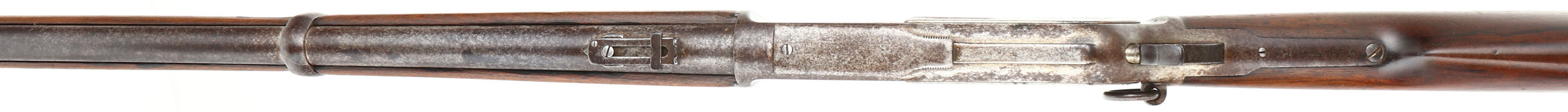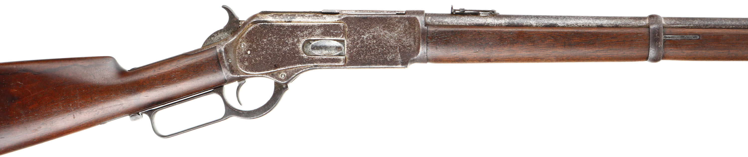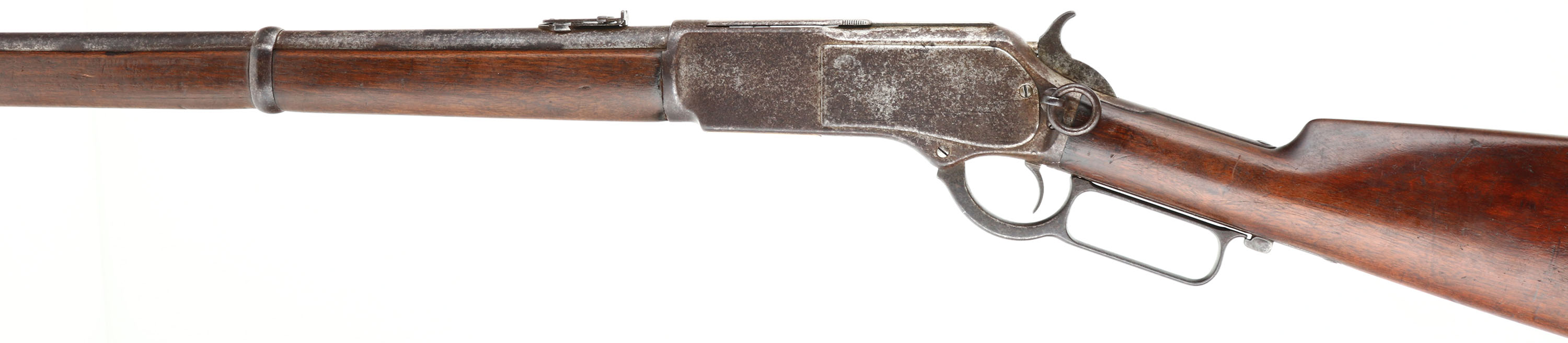 RARE Winchester, Model 1876 ''Centennial Rifle'', Saddle Ring Carbine, 3rd Variation, CAL: 45-75, MFG: 1884, SN: 43428, Lever Action Carbine, 22'' Round barrel, Full mag. The Model 1876 was originally referred to as the Centennial Rifle due to its introduction in the same year as America's Centennial anniversary. Nearly the entire production of the big Model 1876 Winchester was devoted to rifle manufacture. There was a considerable contract for carbines from the Canadian Northwest Mounted Police, but aside from these historic arms, Winchester made carbines for the civilian market on a very limited basis. Total production of all Model 1876's from 1876 to its discontinuance in 1888 (with about 300 additional arms made intermittently to 1898) was a mere 63,871. In comparison, Winchester produced 323,926 of the smaller Model 1873's from 1873-1889. By the end of production of the Model 1873, 720,609 had been produced, More than 10 fold that of the 1876. For this obvious reason, all Model 1876 Winchesters are scarce. The 1876 Saddle Ring Carbines are seldom encountered today as so few were made. Northwest Mounted Police carbines (Mountie Carbines) were a special variant used by the Canadian Northwest Mounted Police. They had a 22'' (56 centimeters) round barrel, were chambered in .45-75 Winchester, with a full length forend & a military style folding ladder rear sight calibrated in meters. This carbine is configured the same, but carries the standard ''1876'' marked folding ladder rear sight, with slide marking from 2 to 10. This carbine was built for the civilian market & is much rarer. The original straight grip wood stocks are excellent, displaying the original finish. They display several minor contusions, scrapes & scratches, with a few little edge nicks to the back edge of the forend. The metal blue finish has entirely tone to a mix of speckled brown patina, gray darkened finish & areas worn to gun metal gray. Bore is very good, displaying light spotting & pitting amongst strong rifling. In addition to the flip-up rear ladder sight, the barrel carries a box small blade carbine front sight. Buttstock carries a carbine metal buttplate. Orginal saddle ring. A rare & all original 1876 SRC collectible.* Antique, No FFL Req. - Value: 7000 to 12000
