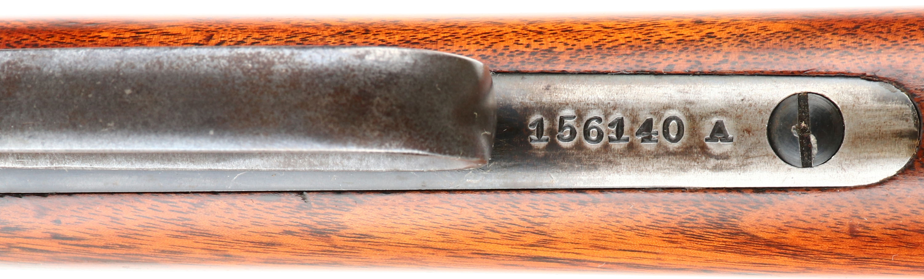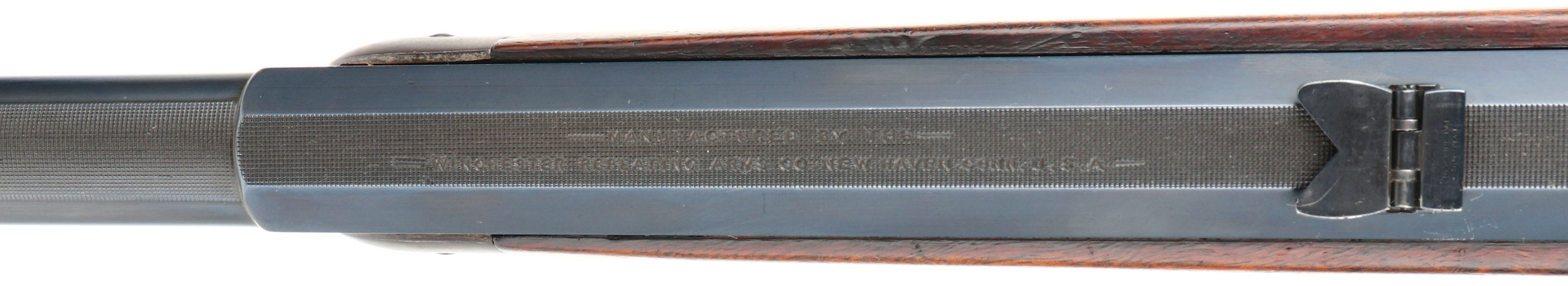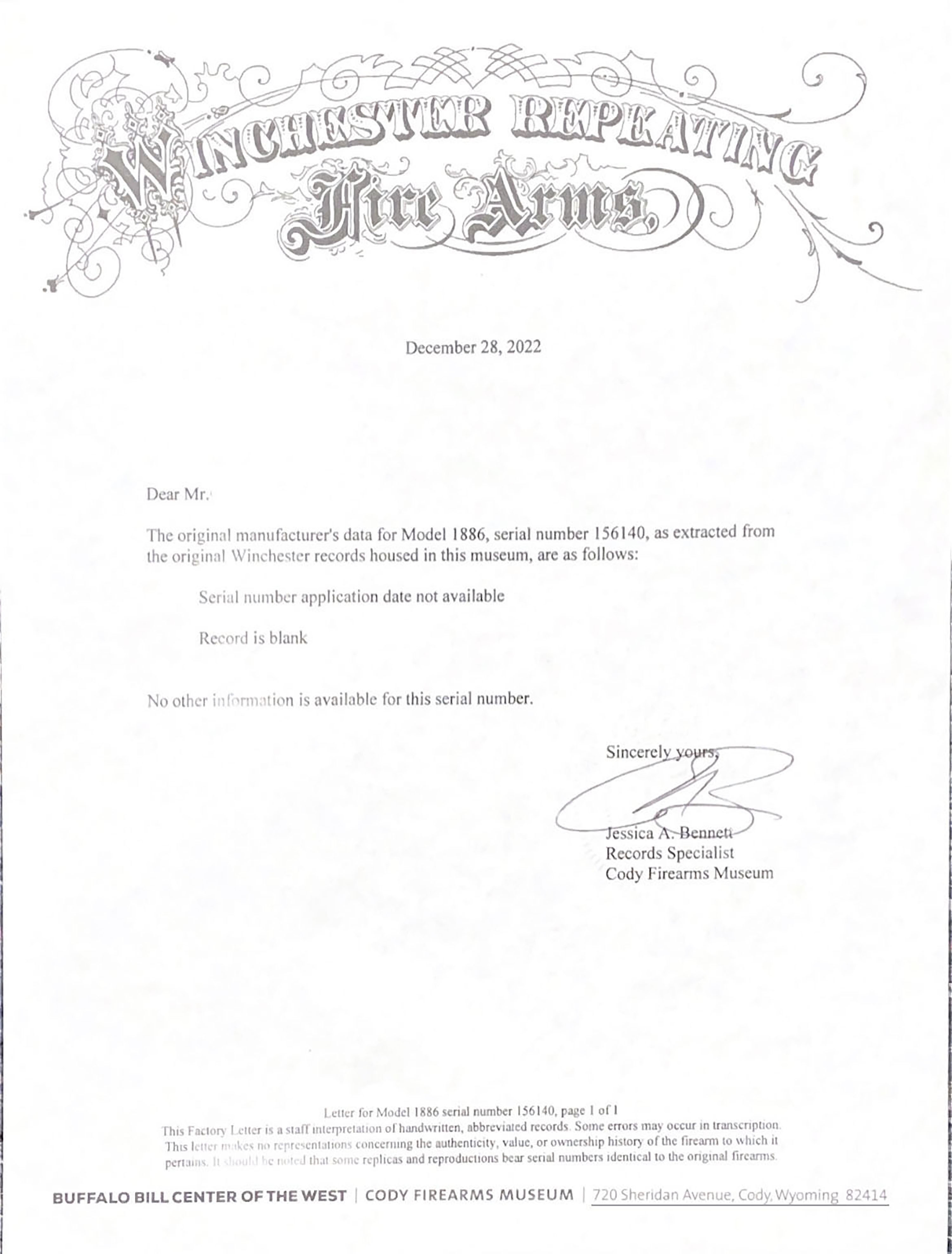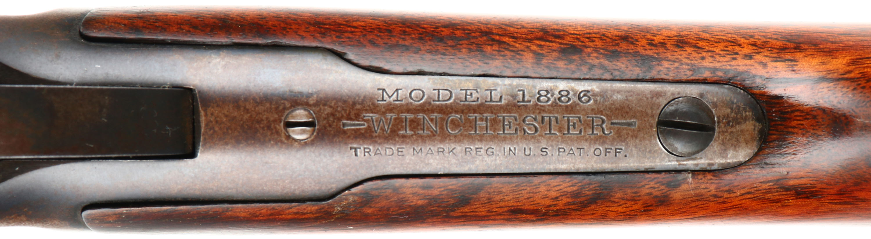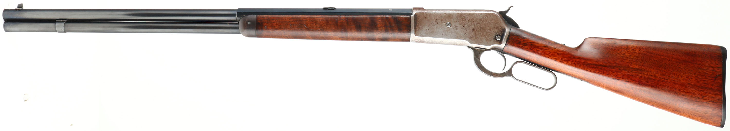 SPECIAL ORDER Winchester, Model 1886, (MATTED BARREL), CAL: 40-82 WCF, MFG: 1918, SN: 156140, Lever Action Rifle, 26'' Half octagon/half round barrel, Full mag. A special order rifle, with unique features. The orginal straight grip stocks are excellent. The stock has been lightly sanded & nicely refinished, with a couple of minor spot with filler, a very small toe chip that has also been filled & a tight repair at the top left corner of the wrist. The repairs & finish are all well done & give an overall excellent appearance. The original forend carries the original finish, with several minor contusions or scratches. The barrel is a special order having a rare full length matted top on the 1/2 octagon 1/2 round barrel. According to a 2007 WACA article on the subject, Winchester records indicate only 206 matted barrel 1886 rifles were produced in all calibers. The high luster metal blue finish on the barrel & mag has been nicely restored & rates 98%, with some light speckling under blue. The receiver, lever, hammer & forend cap are worn or faded mostly gun metal gray, with a thin layer of brown patina. The sliding bolt retains a 85% of its original bright blue. Fitted with a special order two leaf folding rear sight & a small blade front sight. Bore is excellent. Ordered with a Winchester hard rubber, widow's peak, shotgun buttplate. Comes with a Cody Winchester Factory Records Letter, which simply confirms no records for this rifle are available as the record is blank. This rare special order rifle, with a very nice overall appearance.* FFL or C&R Req. - Value: 6000 to 12000