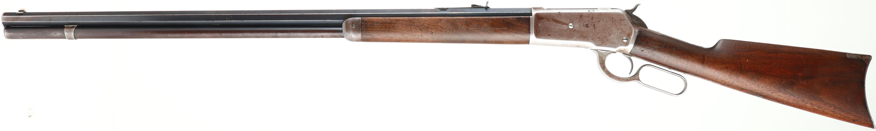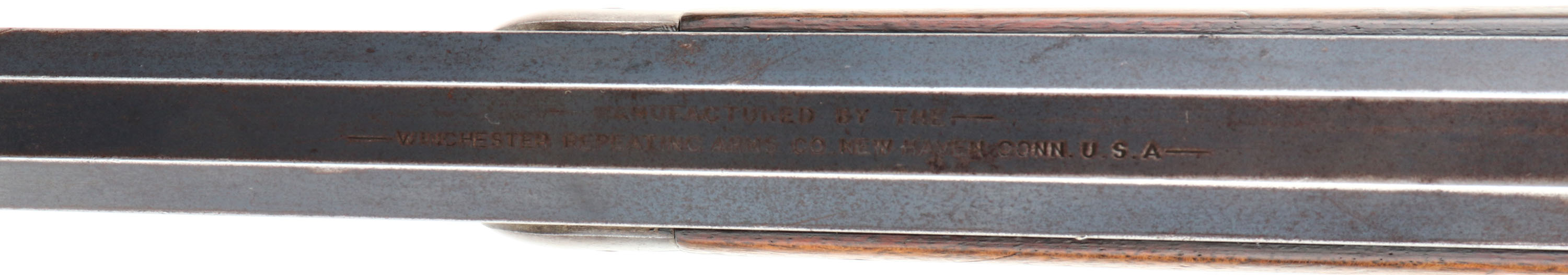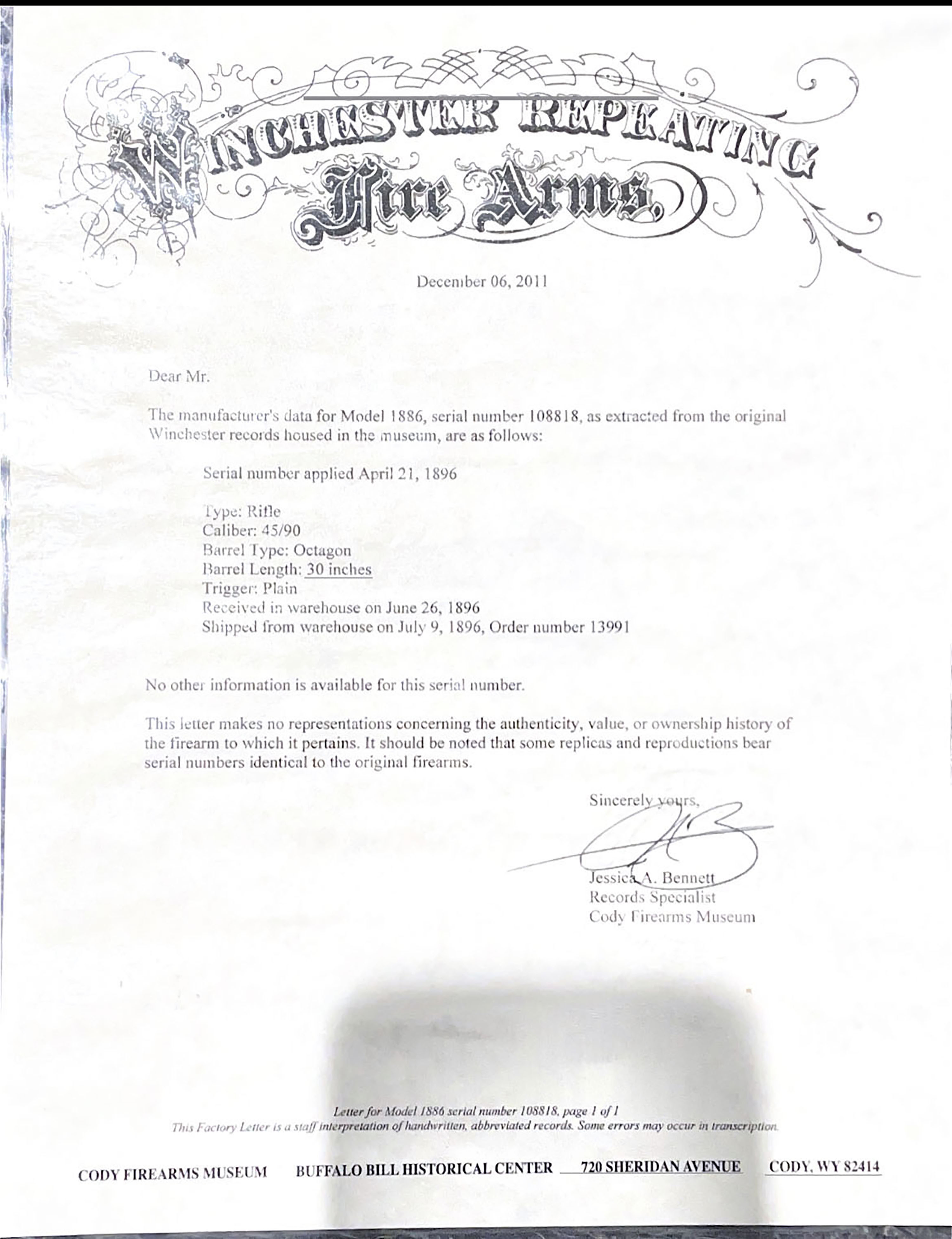 Winchester, Model 1886, 45-90 W.C.F., MFG. 1896, SN: 108818, Lever Action Rifle, SPECIAL ORDER length 30'' Octagon barrel, Full mag. The original straight grip stocks are excellent, retaining the majority of the original finish, with a number of small contusions or scrapes. The original metal blue finish on the barrel rates 85%, with loss due to thinning wear at the edges of flat toning to a brown patina. The mag shows a mix of 40% blue, with the rest a thinning brown patina. The case-hardened receiver, lever & hammer have all faded to a gun metal gray, with a thin & spotty brown patina. The sliding bolt retains a full 90% of its original bright blue. The barrel is fitted with an adjustable rear sight & pinched blade front sight. Bore is very good. Stock carries a crescent metal buttplate. Comes with a Cody Winchester Factory Records Letter, which confirms special order configuration & production dates. An excellent original example of a special order & collectible 1886.* FFL or C&R Req. - Value: 4000 to 6000