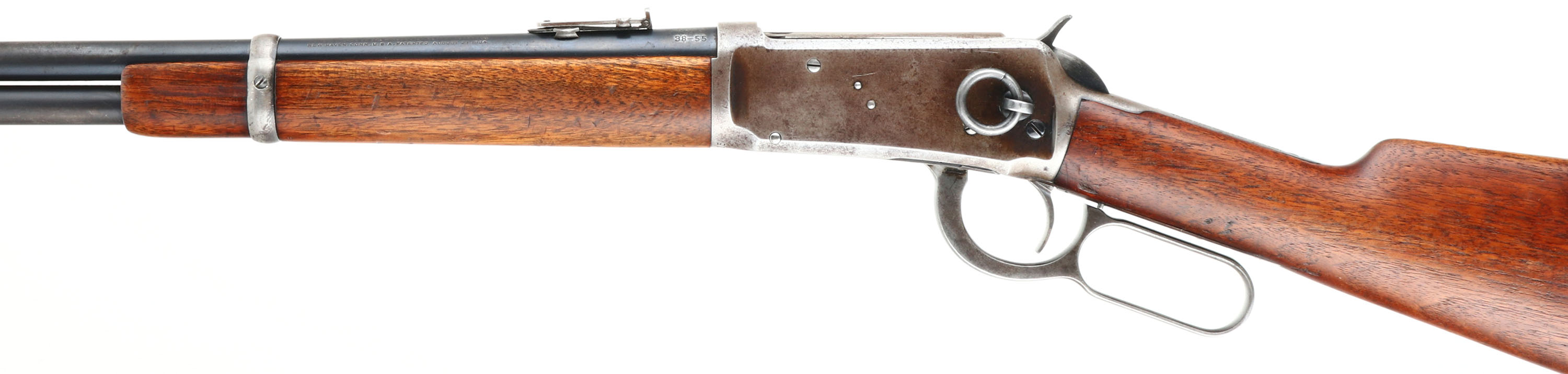 Winchester, Model 1894 SRC, CAL: 38-55, MFG: 1920, SN: 922405, Lever Action Rifle, 20'' Round barrel. Full mag. The straight grip wood stock & forend are excellent, with several minor surface scrapes & small contusions to the original finish. The metal blue finish on the barrel rates 90%, 85% on the mag tube. The receiver has mostly worn or faded to a gun metal gray, with a thin brown patina & some original blue remaining in more protected areas. Bore is excellent. The barrel holds a flip-up rear ladder sight & carbine block blade front sight. Buttstock carries a smooth carbine metal buttplate. Original saddle ring. Smooth tight action. A very nice all original SRC. FFL or C&R Req. - Value: 2000 to 3000