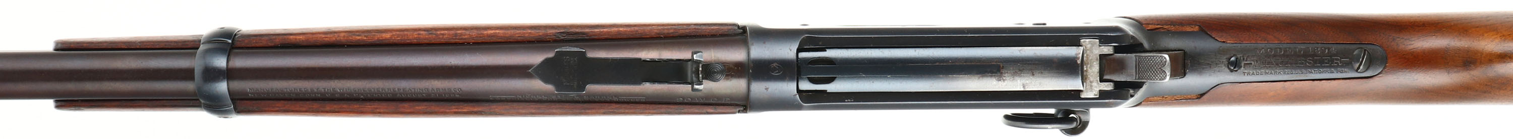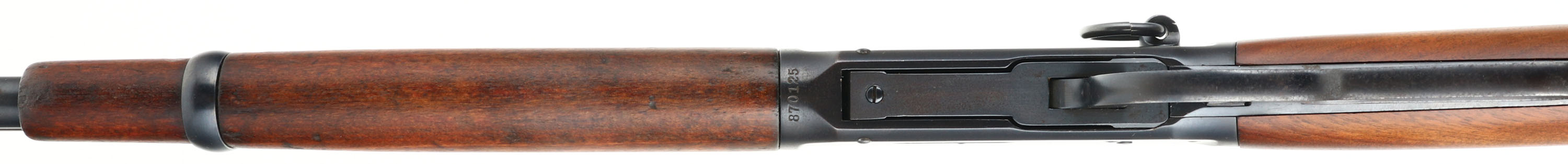 Winchester, Model 94 Saddle Ring Carbine, CAL: 30 WCF, MFG: 1917, SN: 870125, Lever Action Carbine, 20'' Round barrel, Full mag. The straight grip wood stocks are excellent & solid, however the stock appears to be a later Winchester 94 stock. There are missing slivers on both sides at the upper shoulder where the wrist meets the receiver. The stock has very few light handling marks to the original finish. The original forend has minor scratches, scrapes, & contusions to the original finish. The restored metal blue finish rates 98%, with the barrel having a bit of a plum tone. Bore is excellent. The barrel holds an adjustable Marbles buckhorn rear sight & carbine box front sight. Stock carries a checkered metal shotgun buttplate. Original saddle ring. Smooth tight action. Has a very nice overall appearance & should be a great shooter. FFL or C&R Req. - Value: 600 to 1200