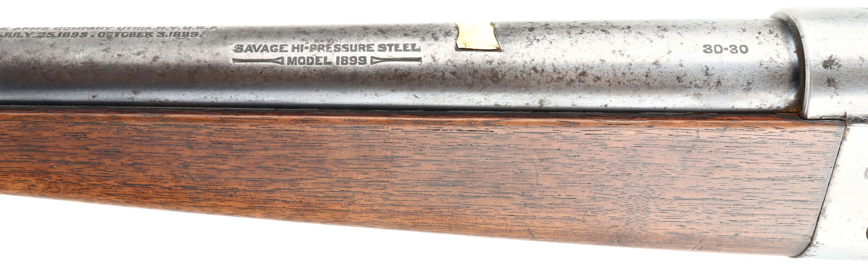 Savage Model 1899, CAL: 30-30, MFG: 1908, SN: 84064, Lever Action Rifle, 20'' Round barrel. The straight grip wood stocks are very good & solid. The stocks carry worn original finish, with numerous small scratches, contusions & scrapes. The metal blue finish has worn mostly gun metal gray, with some remains of blue in protected areas & speckling. Bore is excellent. The receiver carries a Lyman tang sight, while the barrel holds an ivory blank filled rear dovetail & long blade front sight. Crescent metal buttplate. Smooth action. A good old vintage hunting rifle. FFL or C&R Req. - Value: 500 to 1000