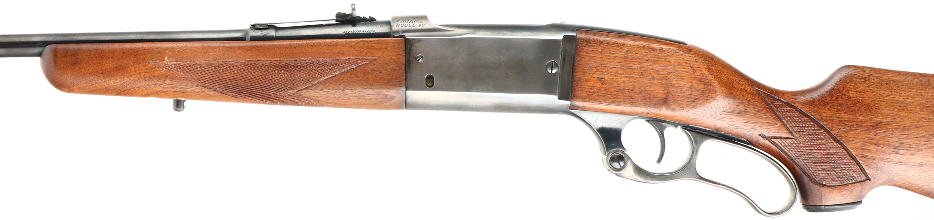 Savage, Model 99, CAL: 250-3000, MFG: 1956, SN: 776361, Lever Action Rifle, 22'' round barrel. The original checkered & capped pistol grip wood stocks are very good & solid, despite large crack repairs & having been sanded & refinished. The stock has a 9'' tight crack repair that runs from the toe to the pistol grip on the right side & another tight 4'' crack repair from comb through to the checkering in the wood. After the repairs, the stock was thinned & reshaped along the belly & comb, especially to the right side. It was then sanded & nicely refinished. There are very few handling marks remaining to the current finish & overall appearance is excellent. The metal blue finish is a combination of original finish & applied finish, with 95% coverage on the barrel, 50% on the receiver. The case-hardened lever has faded mostly gun metal gray. Bore is excellent. The barrel holds an adjustable rear sight & ramp elevated blade front sight. Grooved metal buttplate. Sling studs. Great overall appearance. FFL or C&R Req. - Value: 300 to 600