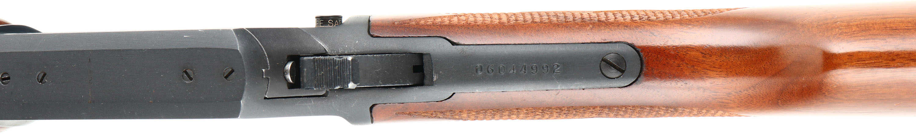 BOXED Marlin, Model 1894S, CAL: 44 Rem Mag, MFG: modern, SN: 06044992, Lever Action Rifle, 20 1/4'' barrel, Full Mag. The original checkered & straight grip wood stocks are excellent, with some minor handling marks to the original finish. The metal blue finish rates 95% overall, with some speckling spots. Bore is excellent. The barrel carries the original adjustable rear & ramp elevated hooded front sights. Receiver is factory tapped & drilled for potential scope mounts. Stock carries a Marlin solid buttpad, missing rear sling stud. Factory trademark bullseye in belly of the stock. An excellent lever action hunting rifle. FFL Req. - Value: 600 to 1000