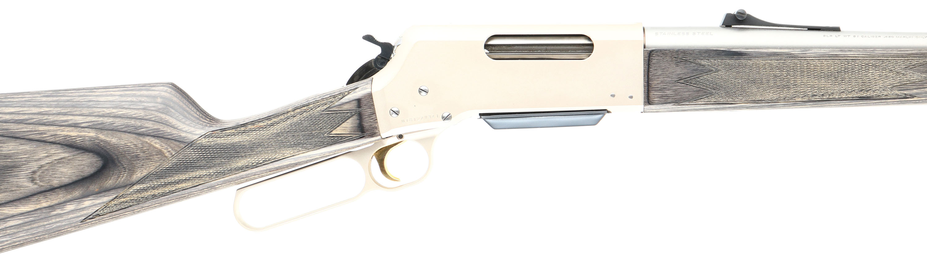 Boxed & NEW Browning, Model BLR 81 Lightweight, Marked .450 Marlin, Cal., MFG. Modern, SN: 01812ZW341, Lever Action Rifle, 20'' round barrel, Detachable 4 round box mag. Original factory checkered gray laminated wood stocks are excellent, with mint original finish. The original stainless steel barrel & satin gray receiver finishes are 100%. Bore is mint. Factory rear & fiber optic front sights. Original black solid recoil pad. Gold Trigger. Rifle comes in correct SN matching box, with packaging & booklet. Essentially a NIB Browning lever. FFL Req - Value: 600 to 1000